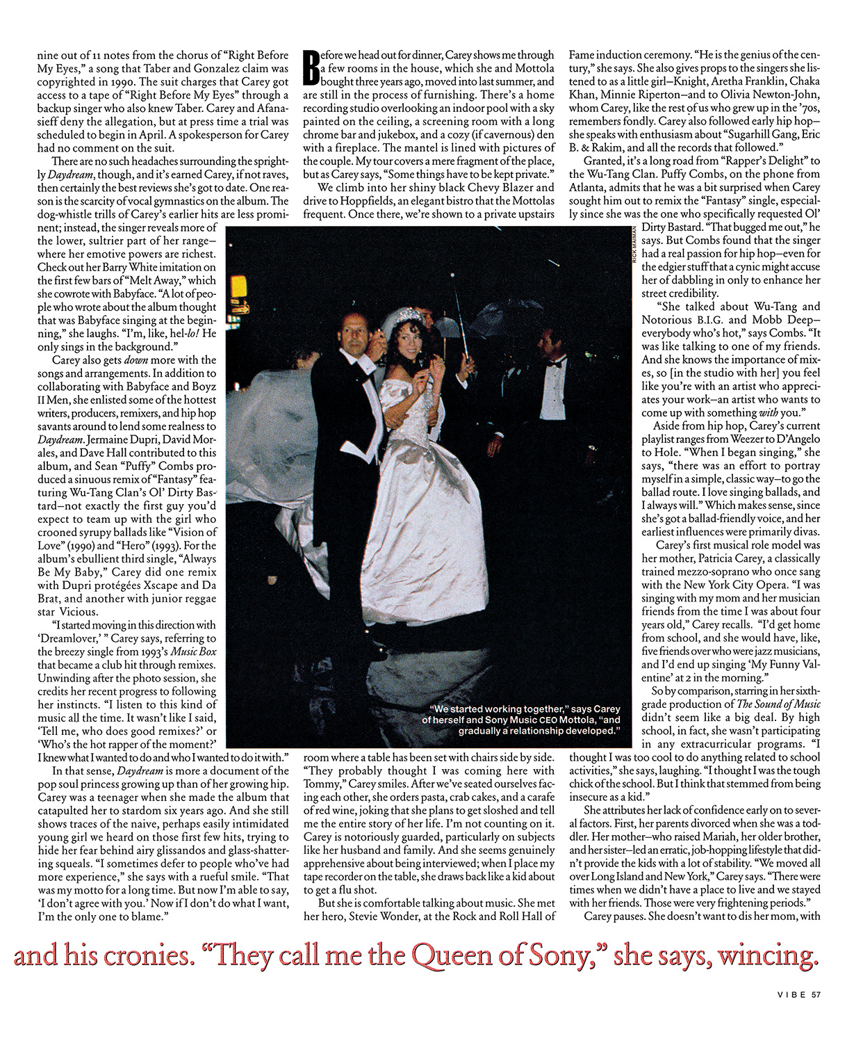 Many cast Carey as a Machiavellian bimbo whose career has benefited greatly from her relationship with Tommy Mottola. Mottola is (a) the man who signed her to Columbia Records in 1989; (b) the current president of Sony Music Entertainment, Columbia's parent corporation; and (c) Carey's husband since 1993. According to the bimbo theory, Carey is coddled and her every creative move dictated by Mottola and his cronies. “They call me the Queen of Sony, or whatever,” she says, wincing at the term.