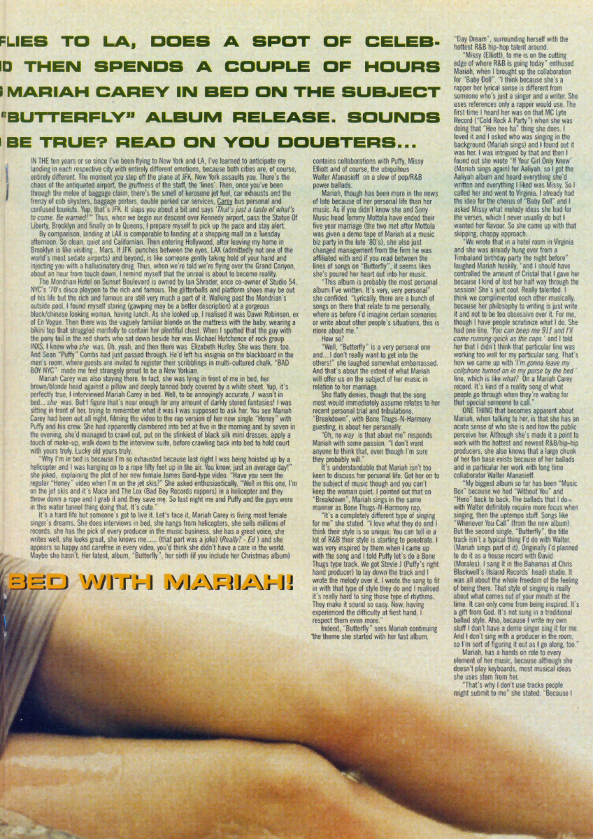 Mariah Carey was also staying there. In fact, she was lying in front of me in bed, her brown/blonde head against a pillow and deeply tanned body covered by a white sheet. Yup, it's perfectly true, I interviewed Mariah Carey in bed. Well, to be annoyingly accurate, I wasn't in bed… she was. But I figure that's near enough for any amount of darkly stored fantasies! I was sitting in front of her, trying to remember what it was I was supposed to ask her. You see Mariah Carey had been out all night, filming the video to the rap version of her new single “Honey” with Puffy and his crew. She had apparently clambered into bed at five in the morning and by seven in the evening, she'd managed to crawl out, out on the slinkiest of black silk mini dresses, apply a touch of make-up, walk down to the interview suite, before crawling back into bed to hold court with yours truly. Lucky old yours truly.