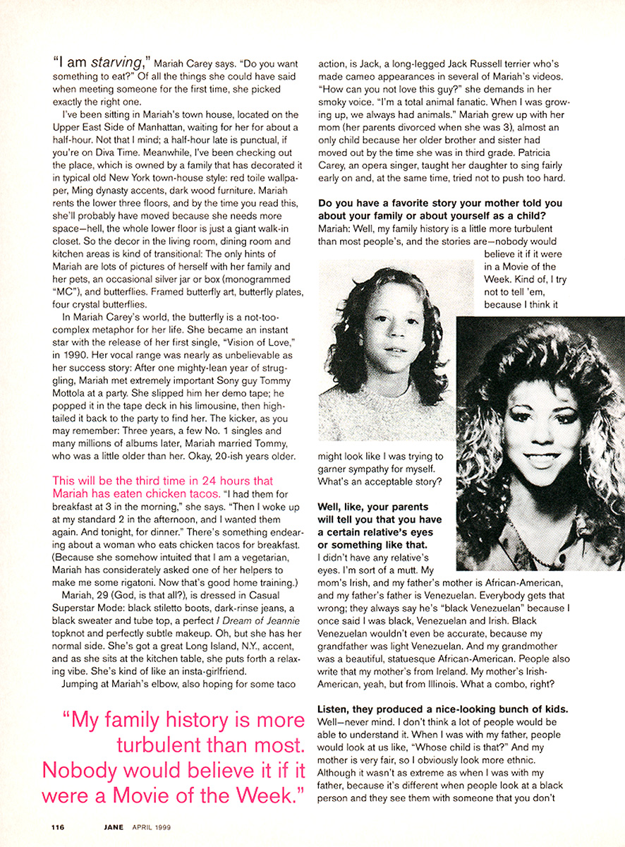 Jumping at Mariah's elbow, also hoping for some taco action, is Jack, a long-legged Jack Russell terrier who's made cameo appearances in several of Mariah's videos. “How can you not love this guy?” she demands in her smoky voice. “I'm a total animal fanatic. When I was growing up, we always had animals.” Mariah grew up with her mom (her parents divorced when she was 3), almost an only child because her older brother and sister had moved out by the time she was in third grade. Patricia Carey, an opera singer, taught her daughter to sing fairly early on and, at the same time, tried not to push too hard.