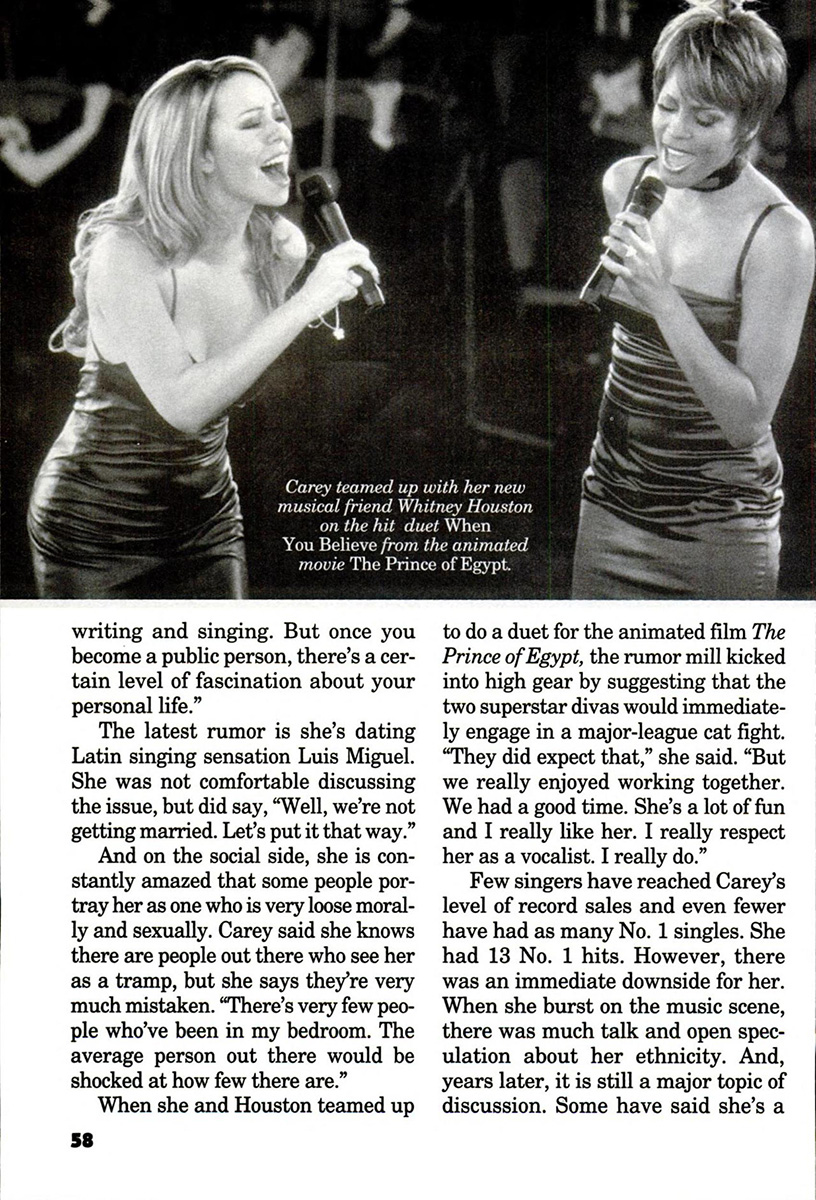 When she and Houston teamed up to do a duet for the animated film The Prince of Egypt, the rumor mill kicked into high gear by suggesting that the two superstar divas would immediately engage in a major-league cat fight. “They did expect that,” she said. “But we really enjoyed working together. We had a good time. She's a lot of fun and I really like her. I really respect her as a vocalist. I really do.”