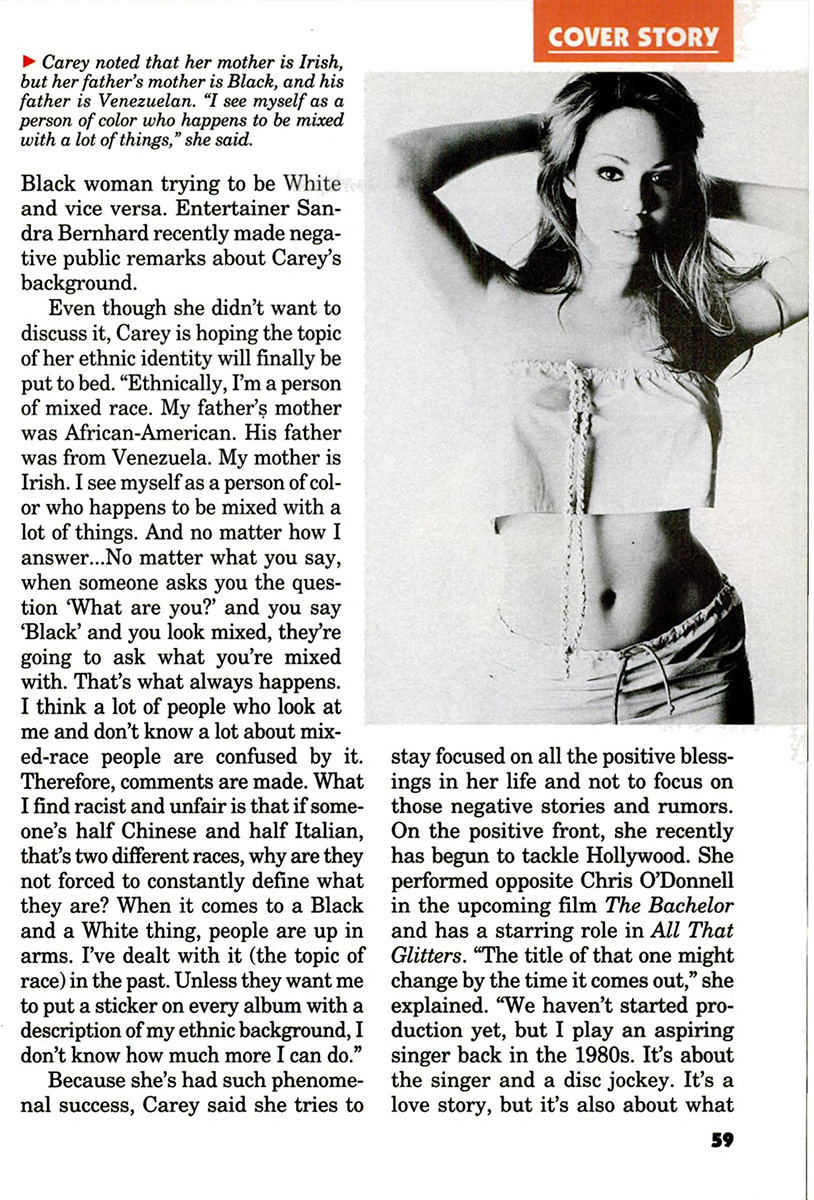 Even though she didn't want to discuss it, Carey is hoping the topic of her ethnic identity will finally be put to bed. “Ethnically, I'm a person of mixed race. My father's mother was African-American. His father was from Venezuela. My mother is Irish. I see myself as a person of color who happens to be mixed with a lot of things. And no matter how I answer… No matter what you say, when someone asks you the question ‘What are you?’ and you say ‘Black’ and you look mixed, they're going to ask what you're mixed with. That's what always happens. I think a lot of people who look at me and don't know a lot about mixed-race people are confused by it. Therefore, comments are made. What I find racist and unfair is that if someone's half Chinese and half Italian, that's two different races, why are they not forced to constantly define what they are? When it comes to a Black and a White thing, people are up in arms. I've dealt with it (the topic of race) in the past. Unless they want me to put a sticker on every album with a description of my ethnic background, I don't know how much more I can do.”