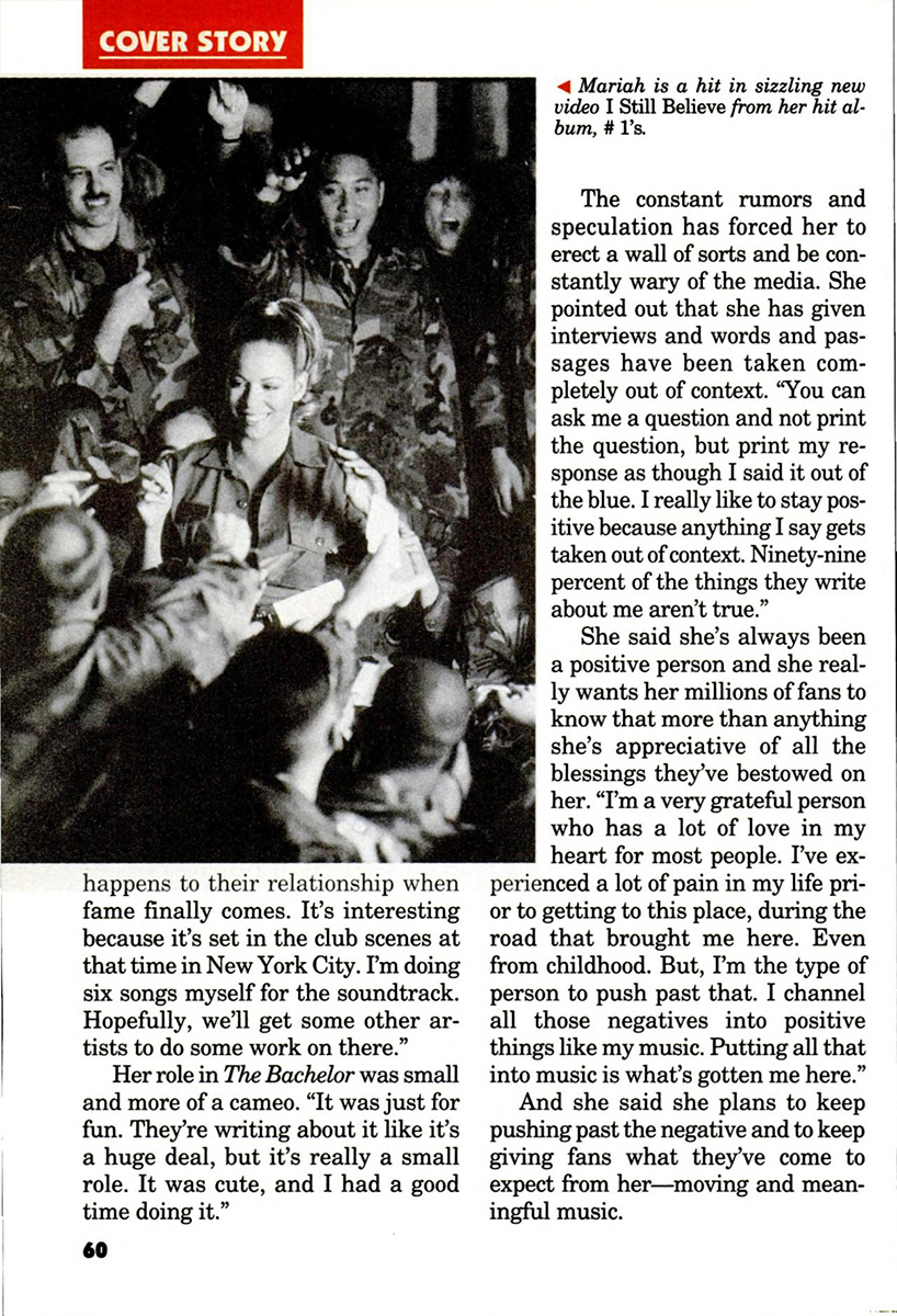 Because she's had such phenomenal success, Carey said she tries to stay focused on all the positive blessings in her life and not to focus on those negative stories and rumors. On the positive front, she recently has begun to tackle Hollywood. She performed opposed Chris O'Donnell in the upcoming film The Bachelor and has a starring role in All That Glitters. “The title of that one might change by the time it comes out,” she explained. “We haven't started production yet, but I play an aspiring singer back in the 1980s. It's about the singer and a disc jockey. It's a love story, but it's also about what happens to their relationship when fame finally comes. It's interesting because it's set in the club scenes at that time in New York City. I'm doing six songs myself for the soundtrack. Hopefully, we'll get some other artists to do some work on there.”