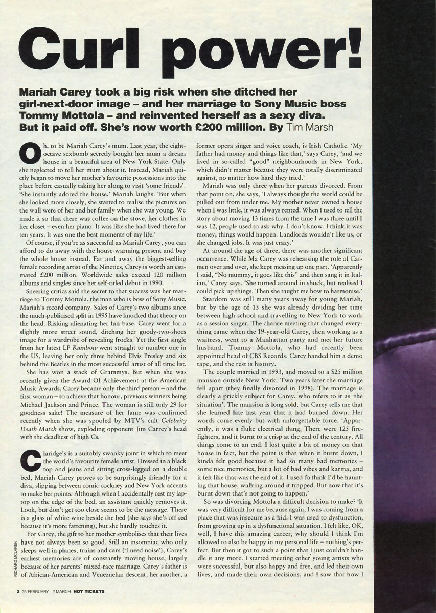 Continuing to work for the same record company, and for the man she used to be married to (who recently announced his engagement to Mexican soap star Thalia, tipped to be the next Mariah Carey) clearly isn't easy either. Carey, who has always insisted on being involved right through from the writing to the mastering of all her projects, feels “maybe because of my bizarre situation with the personal involvement with the record company, I feel I have to work twice as hard as anyone else, because nothing is going to be handed to me. But then, even when I was in the ‘other situation’ things weren't handed to me.”