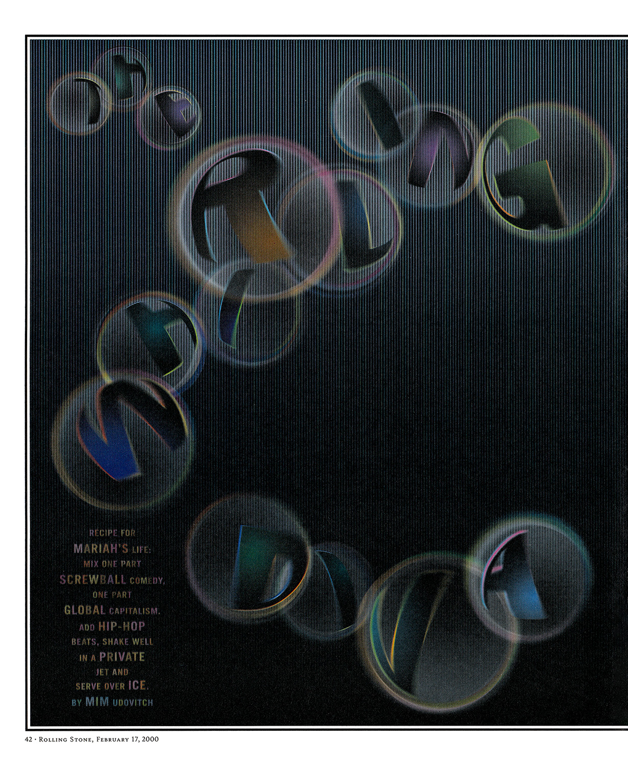 To say that Mariah is a hands-on artist is to vastly understate the case. She is a dizzy dame (all those spirals), but her dizziness in no way indicates a lack of purpose or intelligence; if anything, it indicates an excess of those qualities. She is happy, she is in charge, and she is happy to be in charge. Her 1997 divorce from Sony Music CEO Tommy Mottola, who signed her to her original deal after hearing the demo tape she handed him at a party as a teenager, has had a liberating effect. The marriage was not a peaceful one, and though both parties say that their current relationship is amicable, a burden has obviously been lifted — friends of Mariah's used to jokingly call the house in Bedford Hills, New York, that she shared with Mottola “Sing Sing,” because the perceived demand for new records (“Sing! Sing!”) was so unrelenting. (Incidentally, the house, which was sold in 1998, burned to the ground in December. Neither former spouse was seen running through the neighborhood with a torch.)