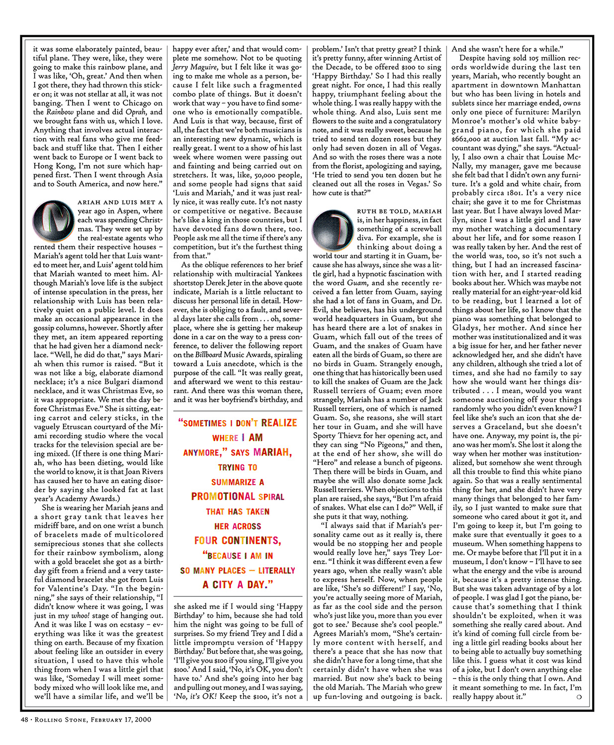 “In the beginning,” she says of their relationship, “I didn't know where it was going, I was just in my whoo! stage of hanging out. And it was like I was on ecstasy everything was like it was the greatest thing on earth. Because of my fixation about feeling like an outsider in every situation, I used to have this whole thing from when I was a little girl that was like, ‘Someday I will meet somebody mixed who will look like me, and we'll have a similar life, and we'll be happy ever after,’ and that would complete me somehow. Not to be quoting Jerry Maguire, but I felt like it was going to make me whole as a person, because I felt like such a fragmented combo plate of things. But it doesn't work that way you have to find someone who is emotionally compatible. And Luis is that way, because, first of all, the fact that we're both musicians is an interesting new dynamic, which is really great. I went to a show of his last week where women were passing out and fainting and being carried out on stretchers. It was, like, 50,000 people, and some people had signs that said ‘Luis and Mariah,’ and it was just really nice, it was really cute. It's not nasty or competitive or negative. Because he's like a king in those countries, but I have devoted fans down there, too. People ask me all the time if there's any competition, but it's the furthest thing from that.”