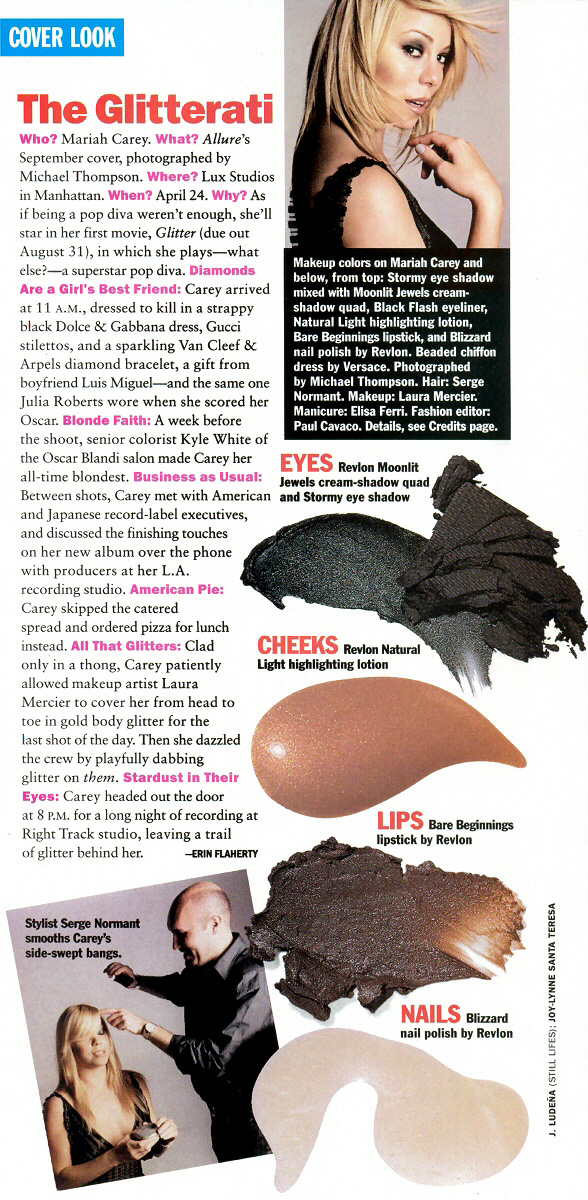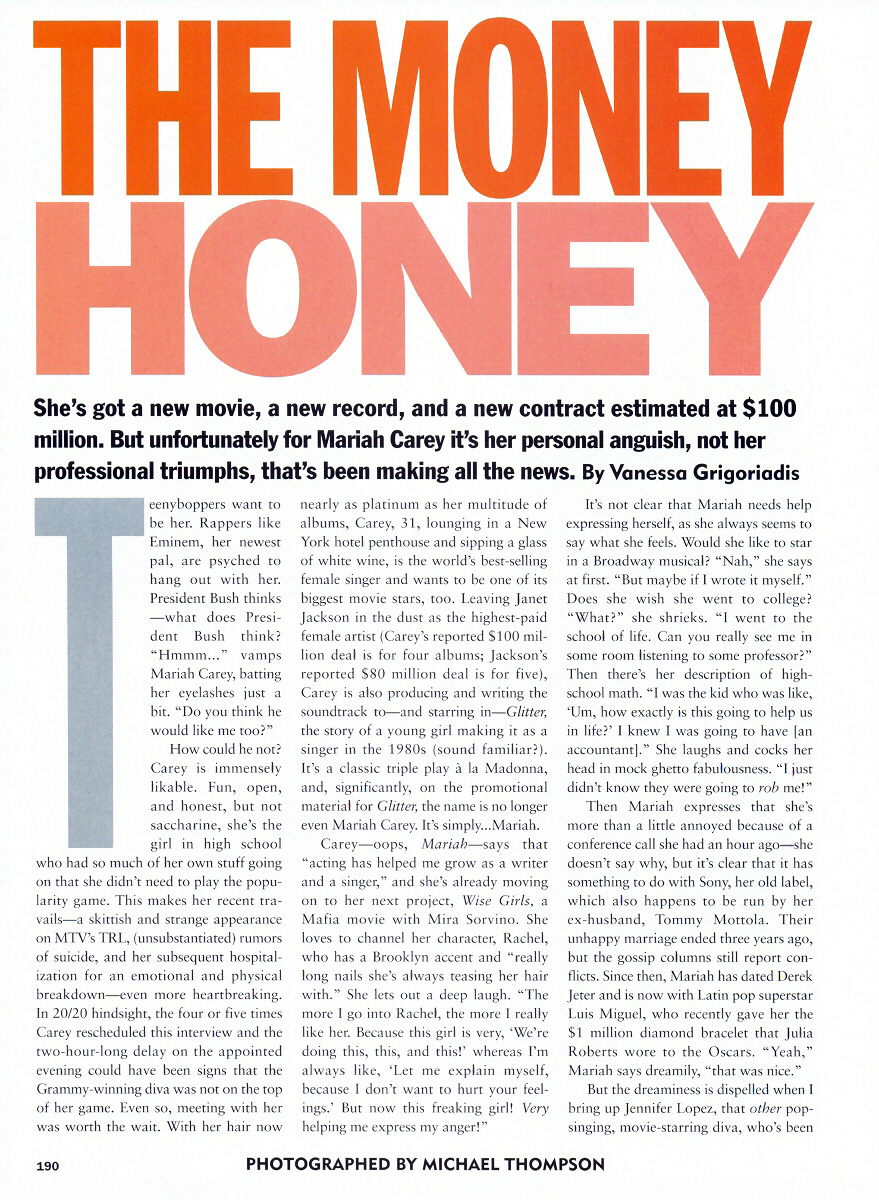 How could he not? Carey is immensely likable. Fun, open, and honest, but not saccharine, she's the girl in high school who had so much of her own stuff going on that she didn't need to play the popularity game. This makes her recent travails — a skittish and strange appearance on MTV's TRL, (unsubstantiated) rumors of suicide, and her subsequent hospitalization for an emotional and physical breakdown — even more heartbreaking. In 20/20 hindsight, the four or five times Carey rescheduled this interview and the two-hour-long delay on the appointed evening could have been signs that the Grammy-winning diva was not on the top of her game. Even so, meeting with her was worth the wait. With her hair now nearly as platinum as her multitude of albums, Carey, 31, lounging in a New York hotel penthouse and sipping a glass of white wine, is the world's best-selling female singer and wants to be one of its biggest movie stars, too. Leaving Janet Jackson in the dust as the highest-paid female artist (Carey's reported $100 million deal is for four albums; Jackson's reported $80 million is for five), Carey is also producing and writing the soundtrack to — and starring in — Glitter, the story of a young girl making it as a singer in the 1980s (sound familiar?). It's a classic triple play a la Madonna, and, significantly, on the promotional material for Glitter, the name is no longer even Mariah Carey. It's simply… Mariah.