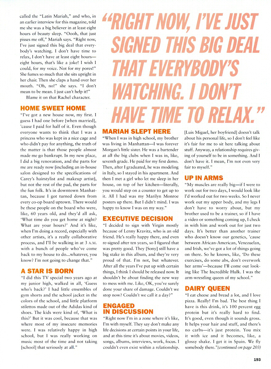 “I've got a new house now, my first. I guess I had one before [when married], 'cause I paid for half of it. Even though everyone wants to think that I was a princess who was kept in a nice cage and who didn't pay for anything, the truth of the matter is that those people almost made me go bankrupt. In my new place, I did a big renovation, and the parts for me are ready now [including an in-house salon designed to the specifications of Carey's hairstylist and makeup artist], but not the rest of the pad, the parts for the fun folk. It's in downtown Manhattan, because I got turned down from every co-op board uptown. There would be these people on the board who were, like, 60 years old, and they'd all ask, ‘What time do you get home at night? What are your hours?’ And it's like, when I'm doing a record, especially with other artists, it's a really collaborative process, and I'll be walking in at 3 A.M. with a bunch of people who've come back to my house to do… whatever, you know? I'm not going to change that.”