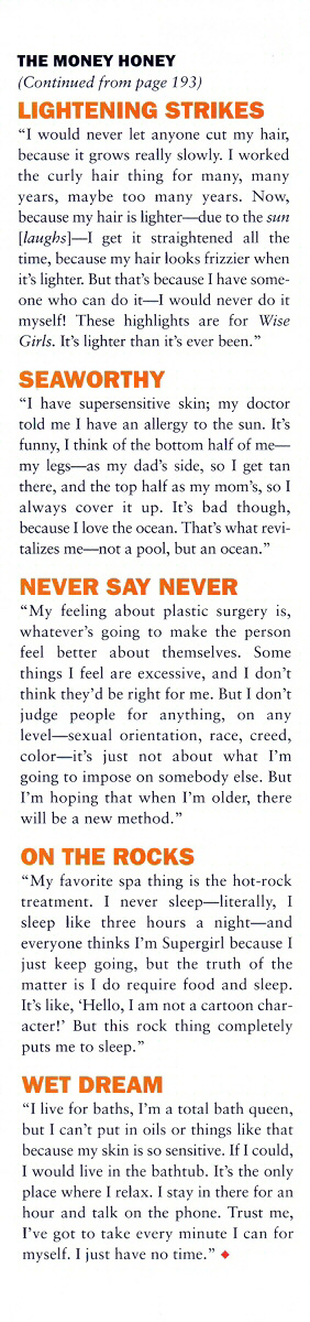 “My favorite spa thing is the hot-rock treatment. I never sleep — literally, I sleep like three hours a night — and everyone thinks I'm Supergirl because I just keep going, but the truth of the matter is I do require food and sleep. It's like, ‘Hello, I am not a cartoon character!’ But this rock thing completely puts me to sleep.”