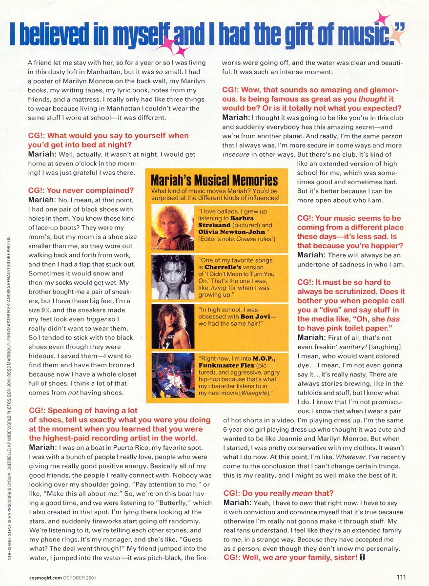 Okay. I'm Mariah Carey's biggest fan. How cliché, right? But it's true. So you guys can imagine how excited, nervous, curious (er, terrified?) was to meet her. Right before the interview, my stomach was in knots! Knots, I tell you! I'd read over and over again about what a diva she is in real life — but the Mariah I met? No way. You'd be surprised how much she's like us: still struggles with guy stuff, does care what people think of her (even though she knows she shouldn't). And this girl loves, loves, loves shoes. More than anything , though, she's just a girl who's accomplished some pretty incredible things (like her new movie and CD, Glitter) and who has to be as tough a businesswoman as anyone else who runs a multimillion-dollar operation. And so busy! These days, Mariah tells me, she's “doing 20 million interviews, plus shooting a video, plus schmoozing at cocktail parties, plus doing another movie, plus trying to maintain my sanity. I have so much on my plate! Right now, I'm like, Okay, this is a lot.” Whew! Does this girl ever sleep? By the time our interview is done, it's 11 p.m. and she still has a room full of the interviewers waiting! But she faced her long night with a smile. She really deserves everything she's got. But judge for yourself, because after all, I am her biggest fan.