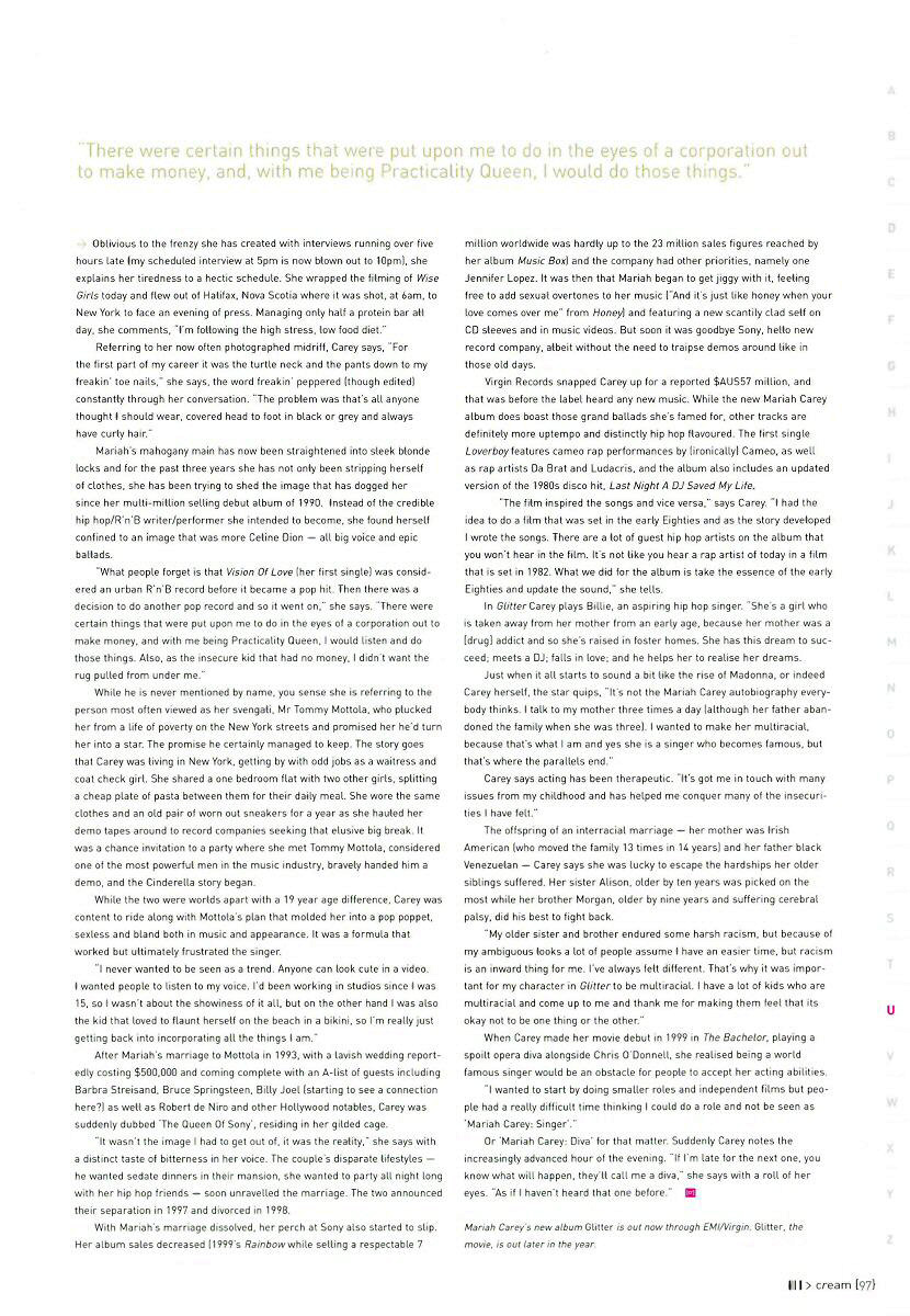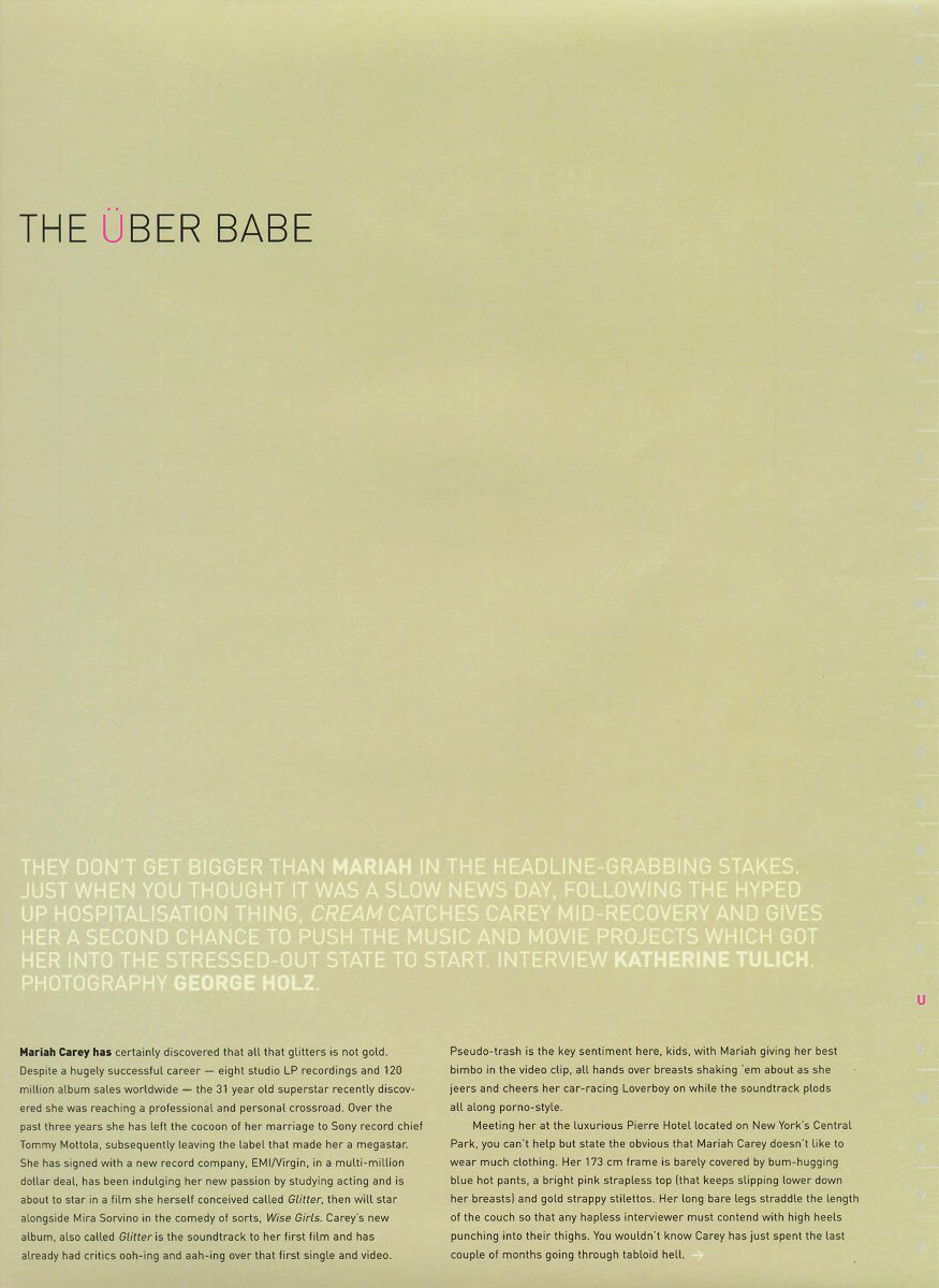 Mariah Carey has certainly discovered that all that glitters is not gold. Despite a hugely successful career — eight studio LP recordings and 120 million album sales worldwide — the 31 year old superstar recently discovered she was reaching a professional and personal crossroad. Over the past three years she has left the cocoon of her marriage to Sony record chief Tommy Mottola, subsequently leaving the label that made her a megastar. She has signed with a new record company, EMI/Virgin, in a multi-million dollar deal, has been indulging her new passion by studying acting and is about to star in a film she herself conceived called Glitter, then will star alongside Mira Sorvino in the comedy of sorts, Wise Girls. Carey's new album, also called Glitter is the soundtrack to her first film and has already had critics ooh-ing and aah-ing over that first single and video.