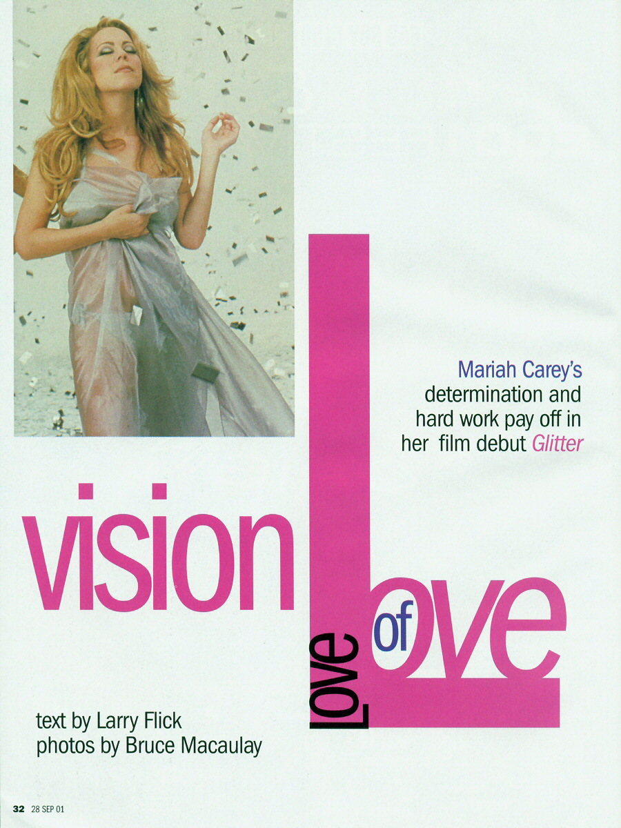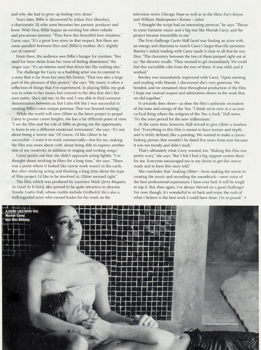 Carey points out that she didn't approach acting lightly. “I've thought about working in films for a long time,” she says. “There was a point where it looked like movie work wasn't in the cards. But after studying acting and thinking a long time about the type of film project I'd like to be involved in, Glitter seemed right.”
