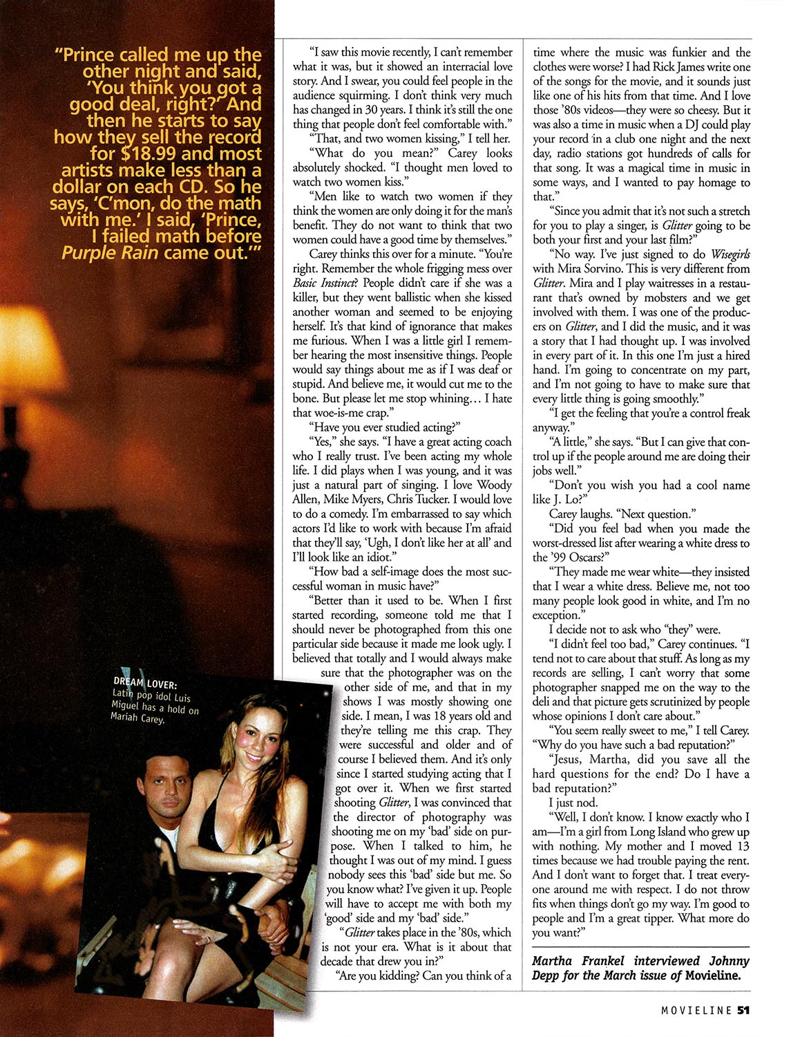 “Better than it used to be. When I first started recording, someone told me that I should never be photographed from this one particular side because it made me look ugly. I believed that totally and I would always make sure that the photographer was on the other side of me, and that in my shows I was mostly showing one side. I mean, I was 18 years old and they're telling me this crap. They were successful and older and of course I believed them. And it's only since I started studying acting that I got over it. When we first started shooting Glitter, I was convinced that the director of photography was shooting me on my ‘bad’ side on purpose. When I talked to him, he thought I was out of my mind. I guess nobody sees this ‘bad’ side but me. So you know what? I've given it up. People will have to accept me with both my ‘good’ side and my ‘bad’ side.”