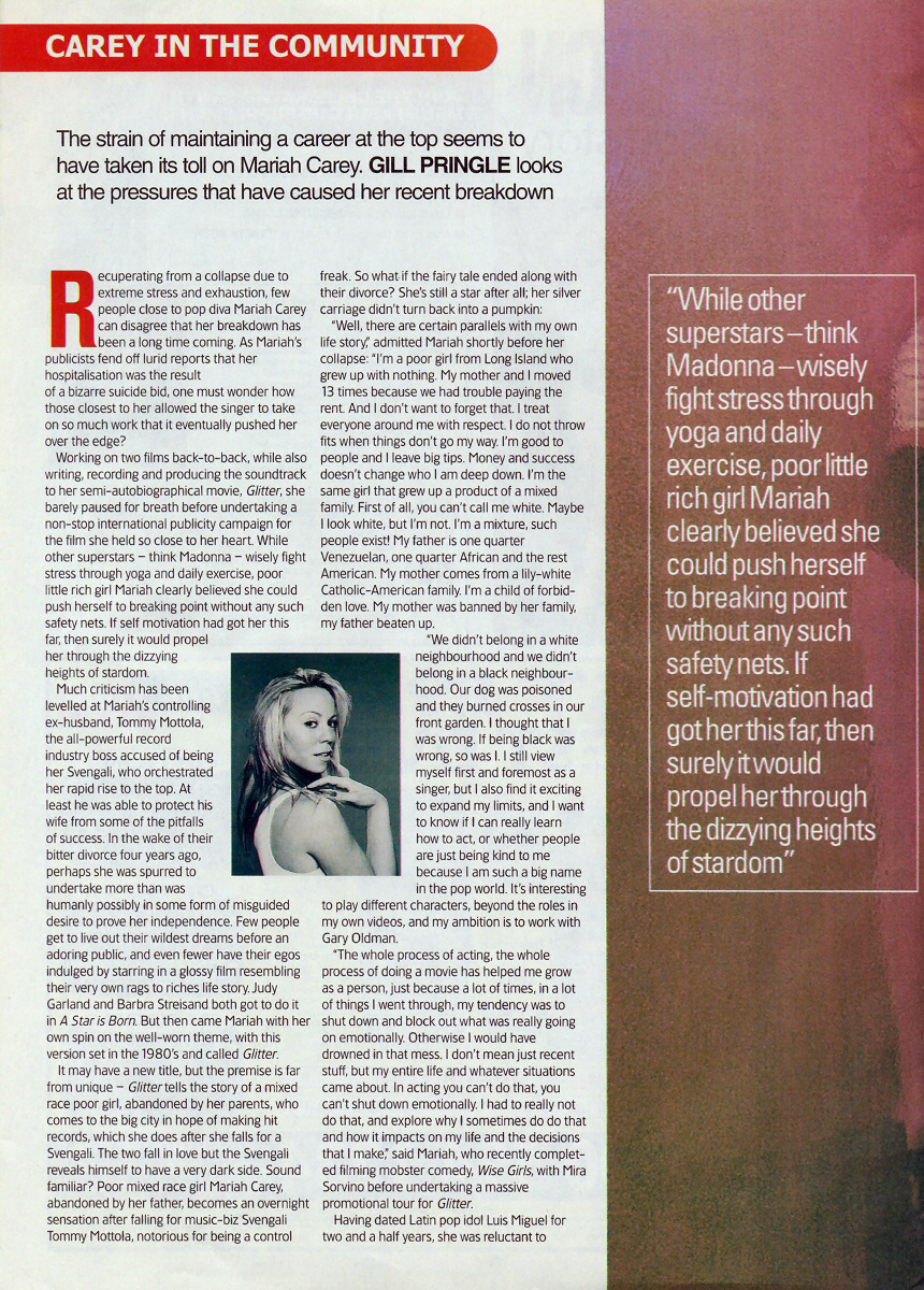 Working on two films back-to-back, while also writing, recording and producing the soundtrack to her semi-autobiographical movie, Glitter, she barely paused for breath before undertaking a non-stop international publicity campaign for the film she held so close to her heart. While other superstars — think Madonna — wisely fight stress through yoga and daily exercise, poor little rich girl Mariah clearly believed she could push herself to breaking points without any such safety nets. If self motivation had got her this far, then surely it would propel her through the dizzying heights of stardom.