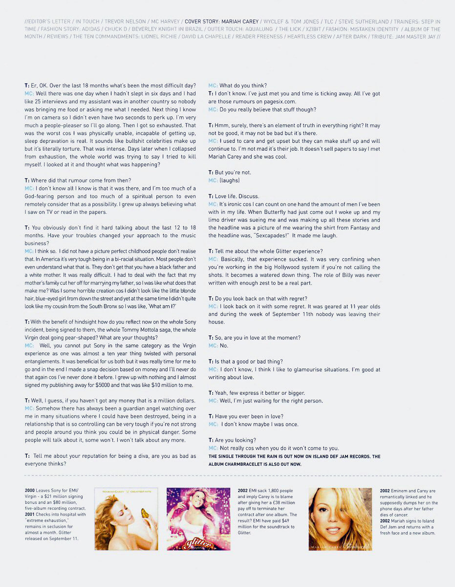 Sitting in a fairly plain studio just off Times Square in Manhattan where Carey's putting the final touches to her latest LP, Charmbracelet, Touch is surprised to find itself alone with Mariah. No PR handlers. No over-zealous record company execs. No ego fluffers. No minders. And most importantly, no pesky animals. Touch, along with a silver platter of freshly-cut raw vegetables, is all alone with the biggest selling female recording artist of all time. Everybody else is made to wait outside for an hour or so.