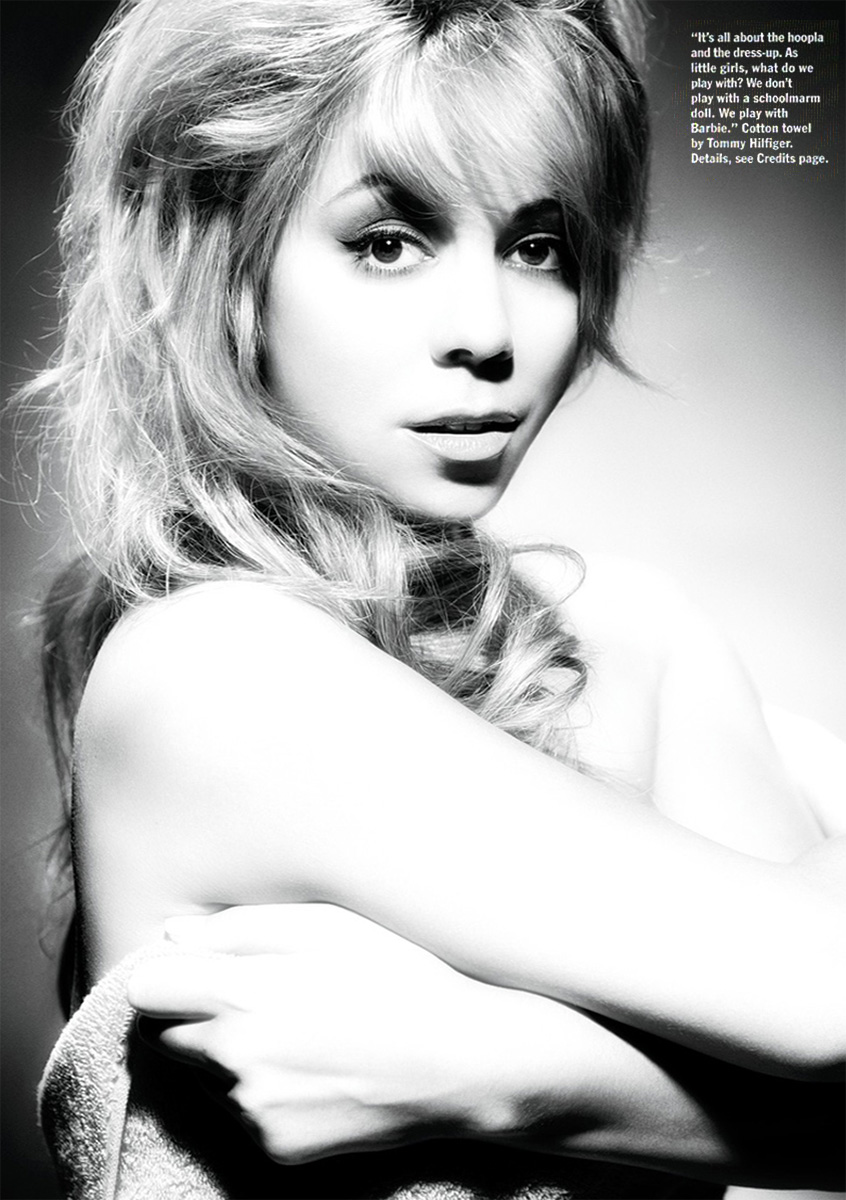 When people question the low-cut dresses, the midriff-baring tops, and the provocative poses, the 32-year-old star is quick to explain. “I've been posing since I was six,” she says, laughing. “My father saved all these pictures of me in a bikini, thinking I was a centerfold. It's all about the hoopla and the dress-up. As little girls, what do we play with? We don't play with a schoolmarm doll. We play with Barbie.”