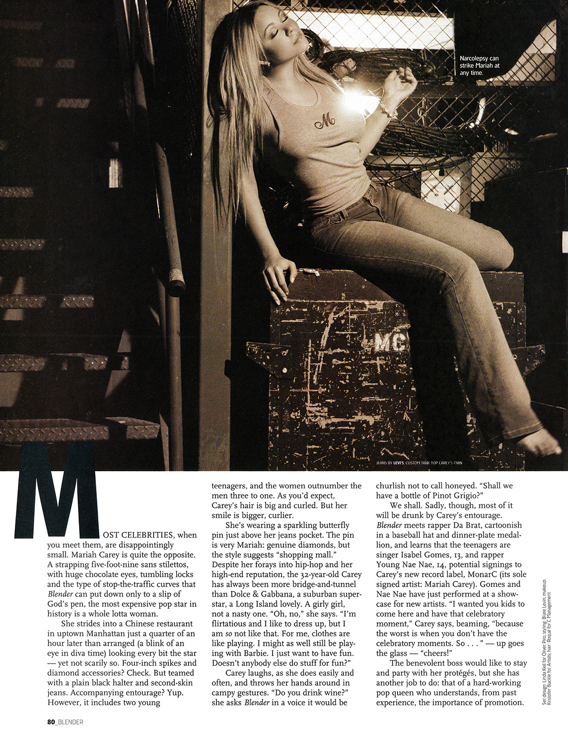 To be truthful, Blender is both disappointed and delighted by Carey's apparent normality. Disappointed because we had half-hoped she would arrive with a selection of fluffy animals and an attitude (great copy!); delighted because Carey is perfectly capable of stringing a coherent sentence together. Anyone who had witnessed her spaced-out performance on MTV Cribs last year — showing off her walk-in closets like a louche, lonely, Valium-conked housewife — would have wondered if there was anything at all behind those sparkling eyes.