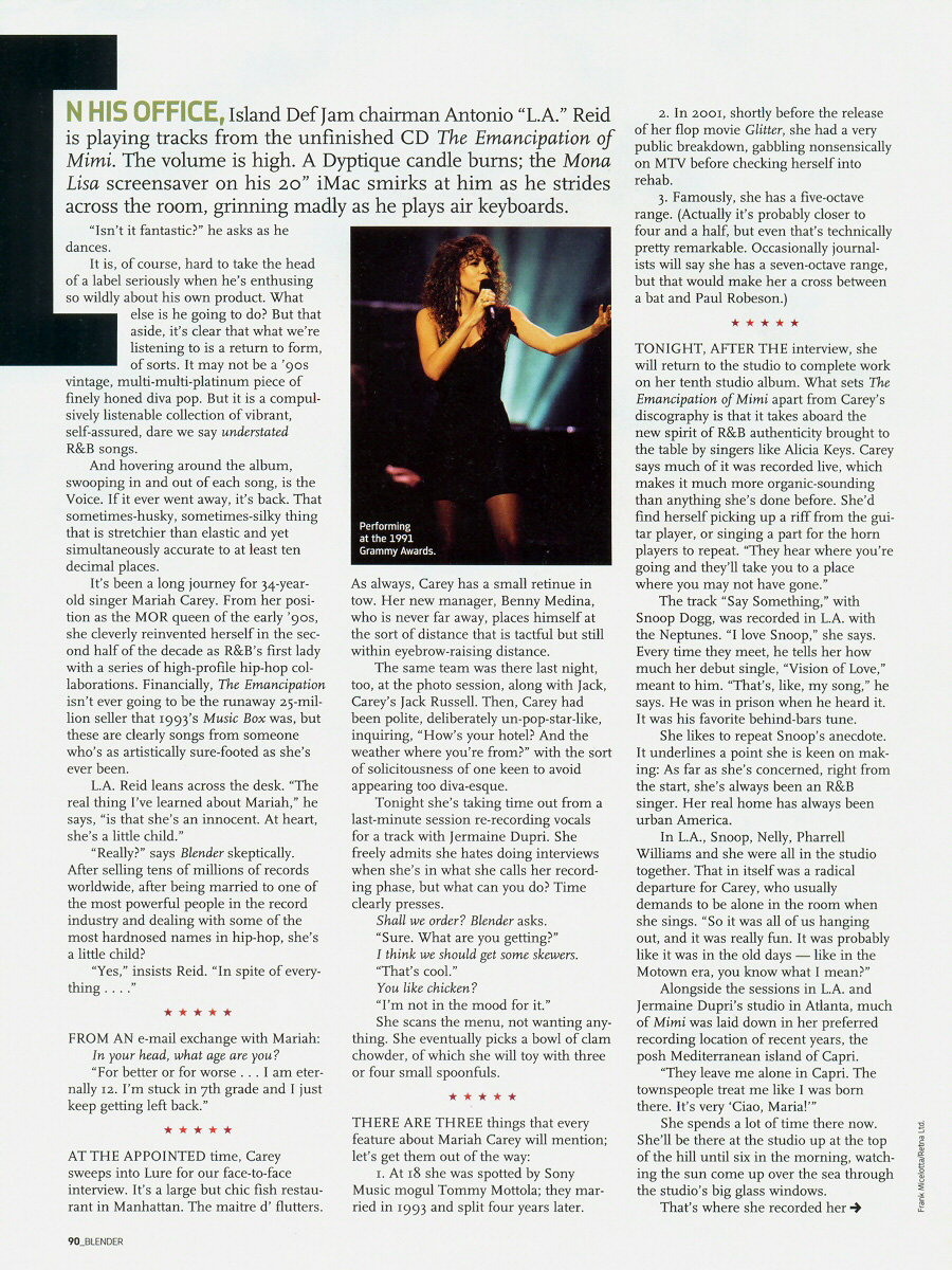 L.A. Reid leans across the desk. “The real thing I've learned about Mariah,” he says, “is that she's an innocent. At heart, she's a little child.”