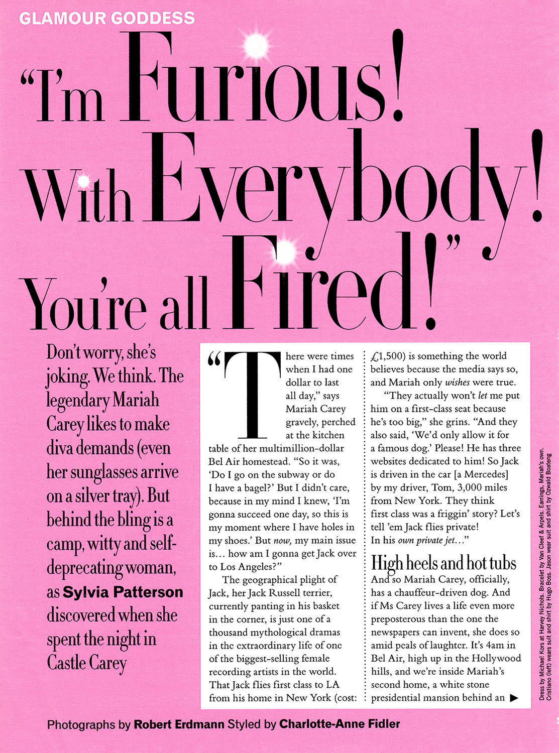 Our stay with Mariah is drawing to a close and Glamour has forgotten to book a cab back to the hotel. Mariah is amused. “Well, I dunno a cab company!” she roars and calls her personal assistant. “Tell me another person you've interviewed who's arranged your transportation!” she hoots. “Now, in this instance, you'd be the diva!” Mariah has an idea: she'll ring her publicist in London and blame her. “Dahling!” roars Mariah into the speaker-phone. “How about this? Sylvia forgot to book a cab. There's no car. She expects Mariah to get her home! I might as well drive the cab myself. I am furious! With everybody! You're all fired!”