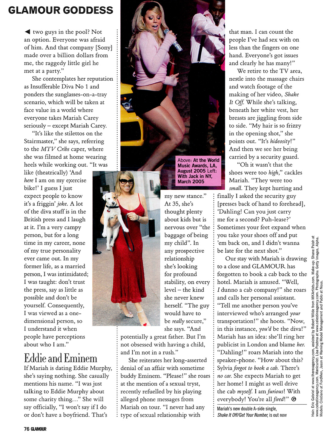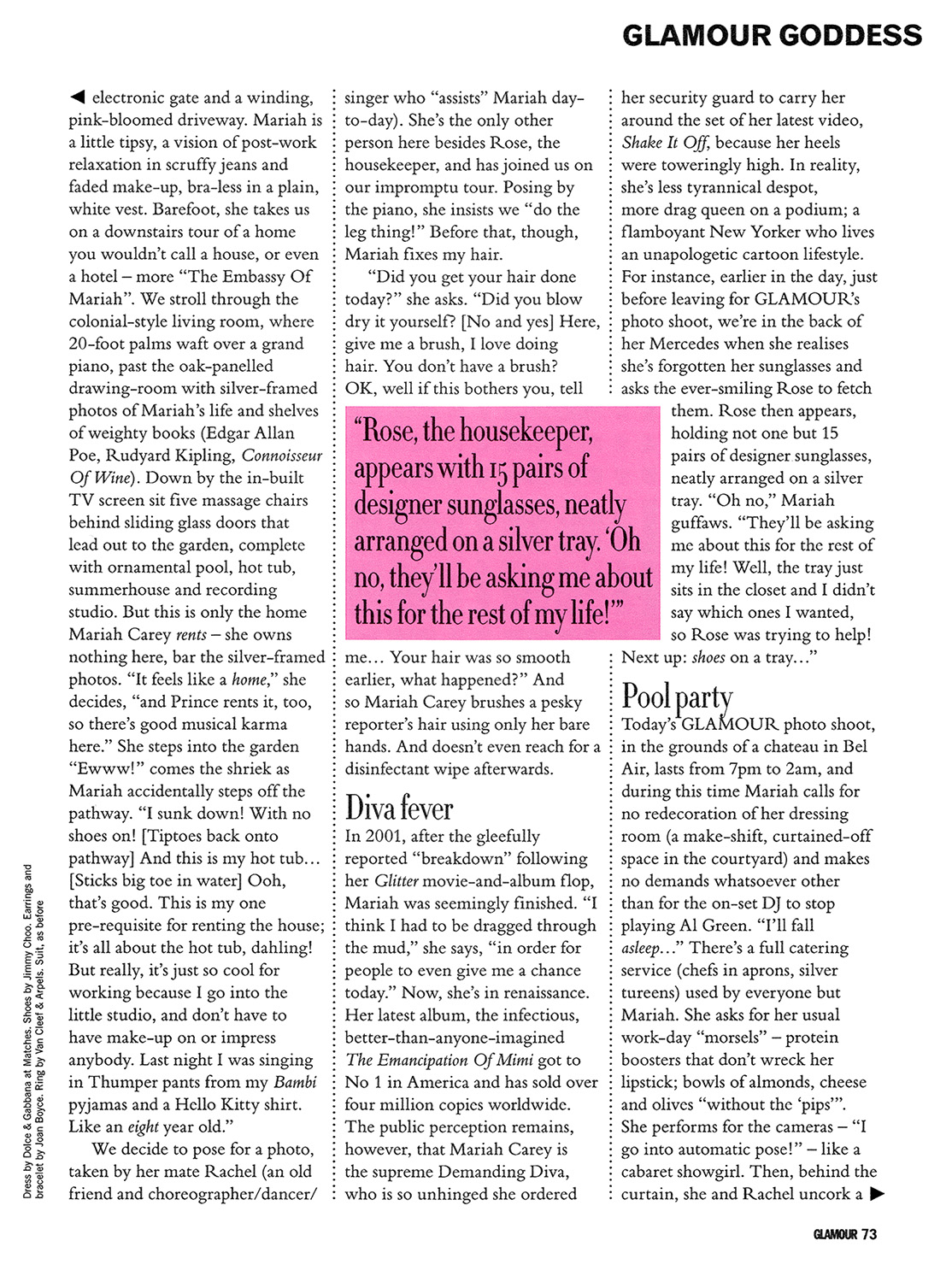 In 2001, after the gleefully reported “breakdown” following her Glitter movie-and-album flop, Mariah was seemingly finished. “I think I had to be dragged through the mud,” she says, “in order for people to even give me a chance today.” Now, she's in renaissance. Her latest album, the infectious, better-than-anyone-imagined The Emancipation Of Mimi got to No 1 in America and has sold over four million copies worldwide. The public perception remains, however, that Mariah Carey is the supreme Demanding Diva, who is so unhinged she ordered her security guard to carry her around the set of her latest video, “Shake It Off,” because her heels were toweringly high. In reality, she's less tyrannical despot, more drag queen on a podium; a flamboyant New Yorker who lives an unapologetic cartoon lifestyle. For instance, earlier in the day, just before leaving for Glamour's photo shoot, we're in the back of her Mercedes when she realises she's forgotten her sunglasses and asks the ever-smiling Rose to fetch them. Rose then appears, holding not one but 15 pairs of designer sunglasses, neatly arranged on a silver tray. “Oh no,” Mariah guffaws. “They'll be asking me about this for the rest of my life! Well, the tray just sits in the closet and I didn't say which ones I wanted, so Rose was trying to help! Next up: shoes on a tray…”