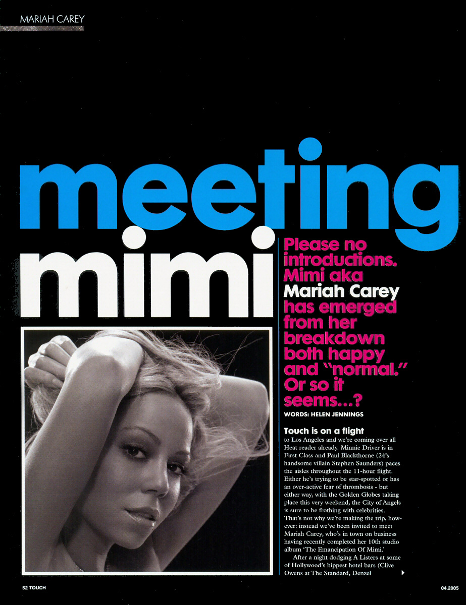 Touch is on a flight to Los Angeles and we're coming over all Heat reader already. Minnie Driver is in First Class and Paul Blackthorne (24's handsome villain Stephen Saunders) paces the aisles throughout the 11-hour flight. Either he's trying to be star-spotted or has an over-active fear of thrombosis — but either way, with the Golden Globes taking place this very weekend, the City of Angels is sure to be frothing with celebrities. That's not why we're making the trip, however; instead we've been invited to meet Mariah Carey, who's in town on business having recently completed her 10th studio album The Emancipation of Mimi.