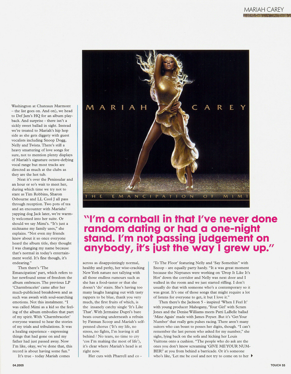 Next it's over the Peninsular and an hour or so's wait to meet her, during which time we try not to stare at Tim Robbins, Sharon Osbourne and LL Cool J all pass through reception. Two pots of tea and an encounter with Mariah's yapping dog Jack later, we're warmly welcomed into her suite. Or should we say Mimi's. “It's just a nickname my family uses,” she explains. “Not even my friends knew about it so once everyone heard the album title, they thought I was changing my name because that's normal in today's entertainment world. It's fine though, it's endearing.”