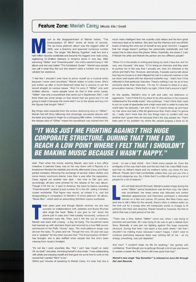 Three years past and though Mariah reminds me she had success on collaborations with Jadakiss and Busta Rhymes (she sings the hook “Baby if you give to me” down the phone just in case and I feel suitably honoured), rumours of retirement was rife. Then, and it felt like out of nowhere, Mariah was back with a bang — a big, fat bang. The household name had teamed up with Jermaine Dupri and returned to a true R&B sound, reminiscent of the Puffy “Honey” days. The multi-platinum singer was all over the radio, TV, press and net. Though the now, 35-year-old says she is “grateful” for the chart success that The Emancipation Of Mimi has brought, she is also baffled when people feel like she's been missing from music's limelight.