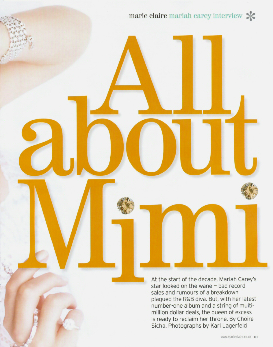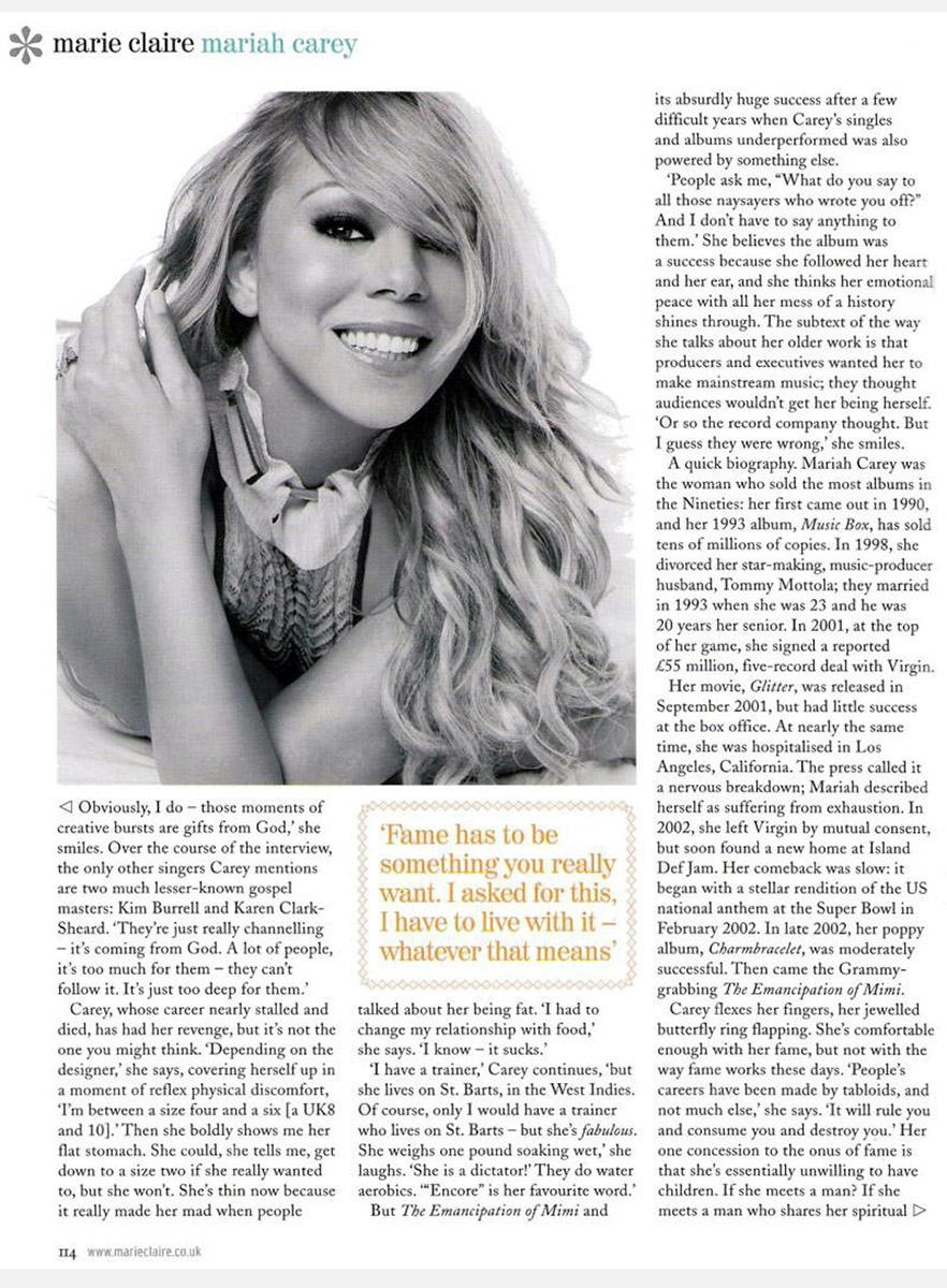 Carey says she hears song bits in her head all the time — fleeting bits of melisma and complicated modulations and melodies — but so briefly that she sometimes has to call her answerphone to record them or have a musician around to help her explore them. She prefers working late at night, in a dark studio. Recently, she's been recording in Anguilla in the West Indies and on the island of Capri, looking out over the Mediterranean. “I really work well by the water,” she says. And where do these musical ideas come from? “I don't know where,” she answers. Then, “No! Obviously, I do — those moments of creative bursts are gifts from God,” she smiles. Over the course of the interview, the only other singers Carey mentions are two much lesser-known gospel masters: Kim Burrell and Karen Clark-Sheard. “They're just really channelling — it's coming from God. A lot of people, it's too much for them — they can't follow it. It's just too deep for them.”