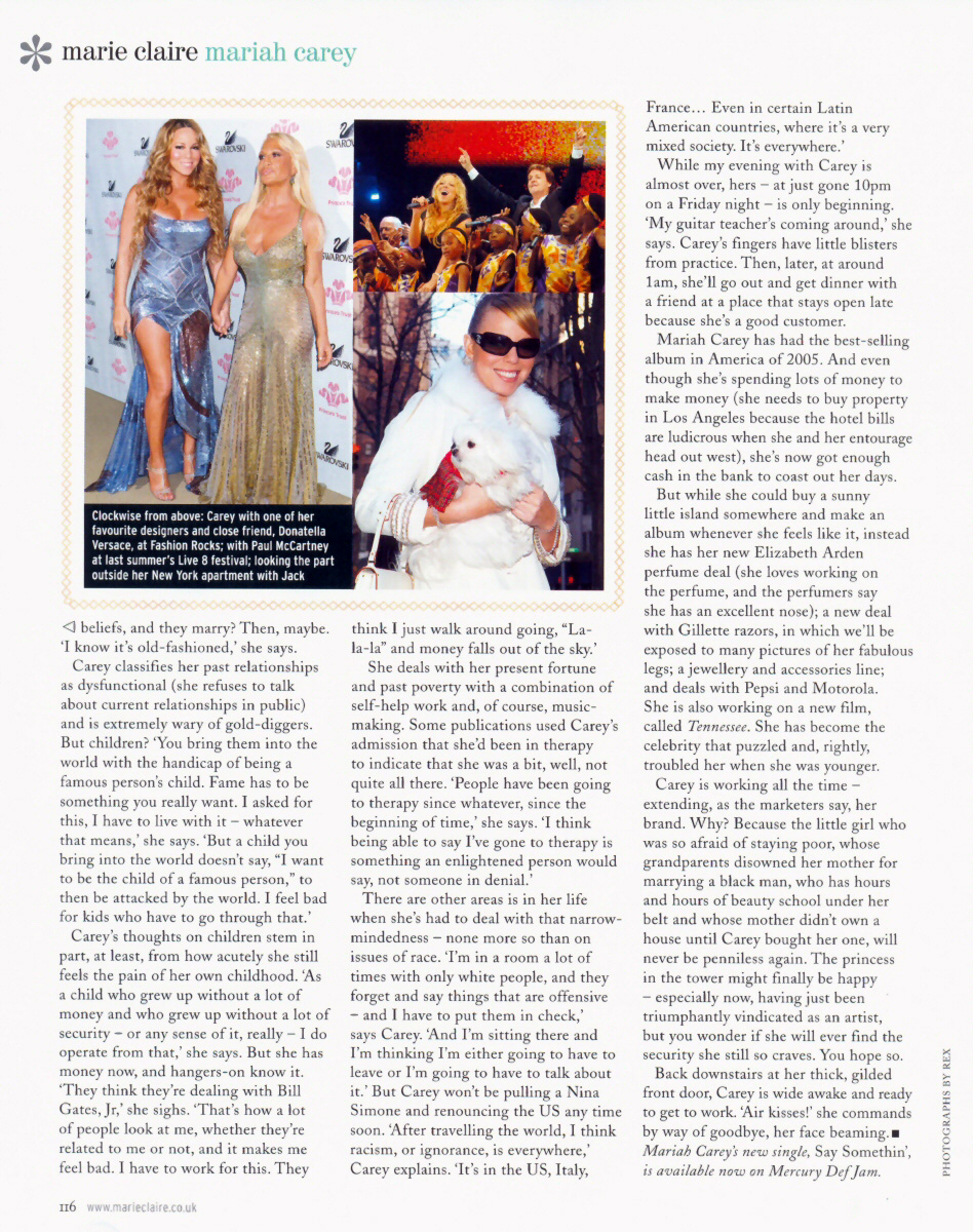 She deals with her present fortune and past poverty with a combination of self-help work and, of course, music-making. Some publications used Carey's admission that she'd been in therapy to indicate that she was a bit, well, not quite all there. “People have been going to therapy since whatever, since the beginning of time,” she says. “I think being able to say I've gone to therapy is something an enlightened person would say, not someone in denial.”