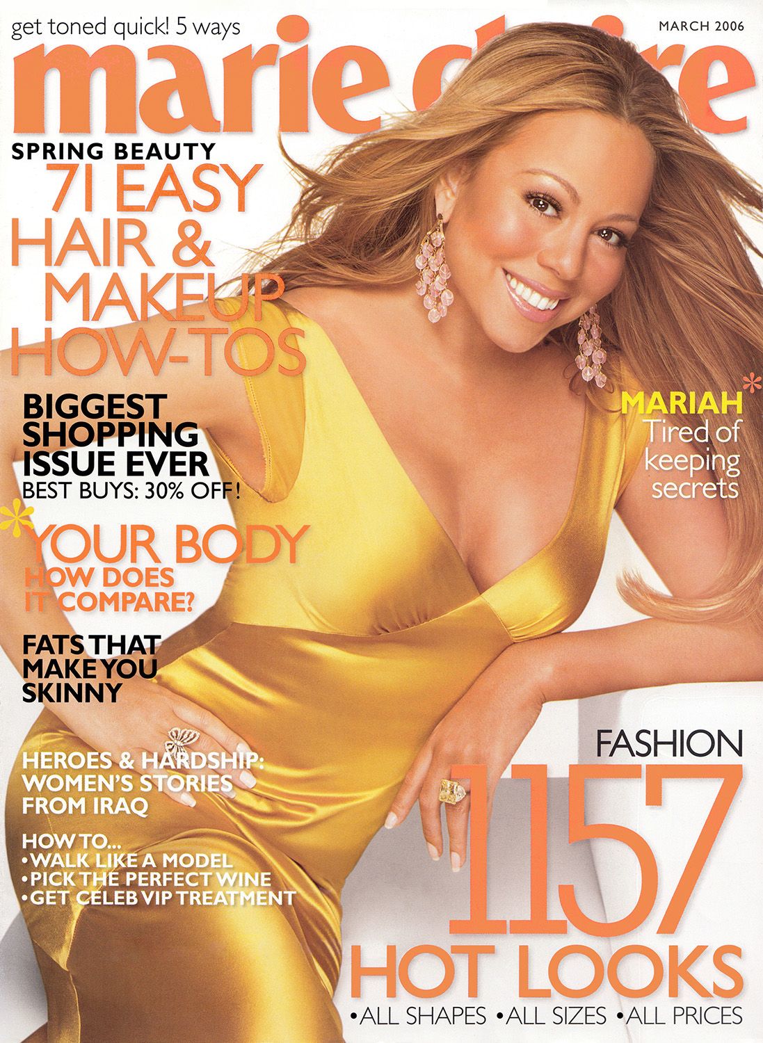On the cover of The Emancipation of Mimi, Carey says she is “a little thicker, curvier” than she's been on past album covers. “I'm bad with the weight thing. I go up and down really quickly, because I am a muscular person. People don't know I have this” — she flexes to display well-defined biceps — “and these could easily become weird body-builder arms. But I also don't want to be a skinny twig.”