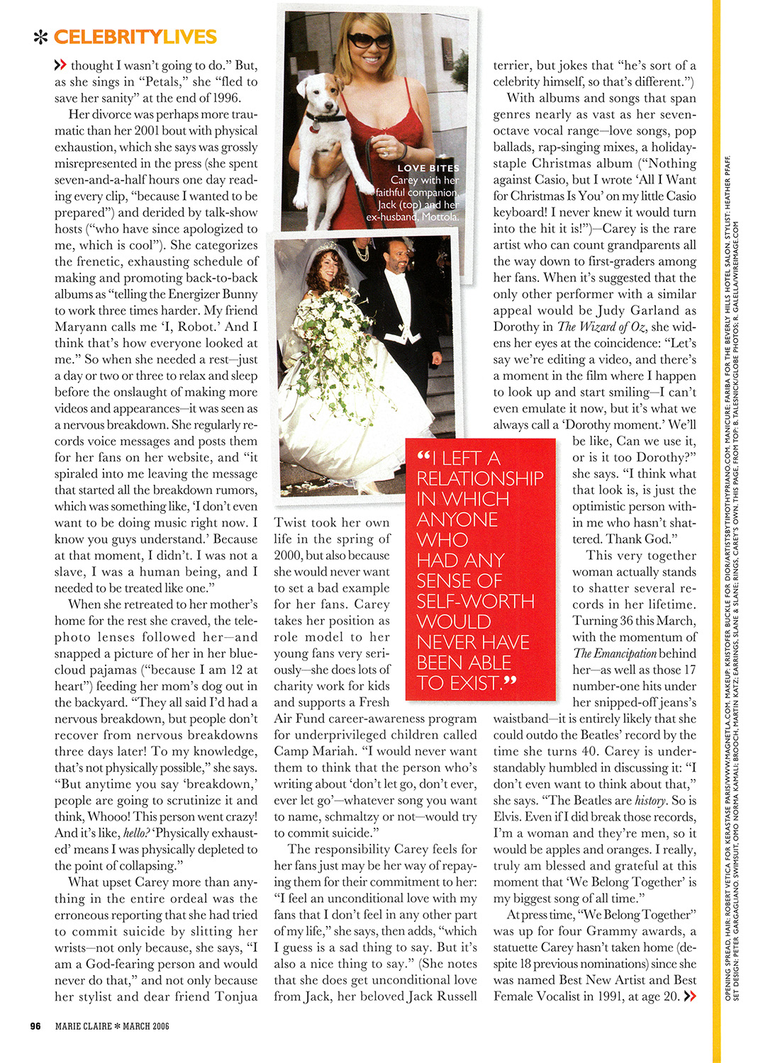 The responsibility Carey feels for her fans just may be her way of repaying them for their commitment to her: “I feel an unconditional love with my fans that I don't feel in any other part of my life,” she says, then adds, “which I guess is a sad thing to say. But it's also a nice thing to say.” (She notes that she does get unconditional love from Jack, her beloved Jack Russell terrier, but jokes that “he's sort of a celebrity himself, so that's different.”)