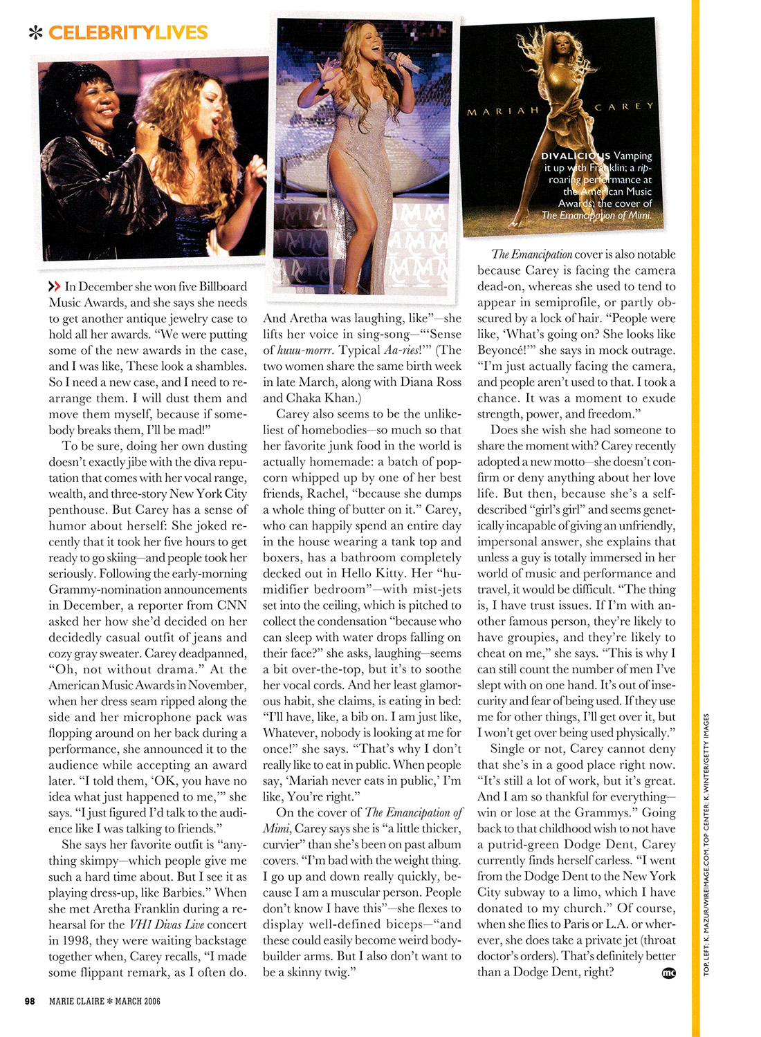 At press time, “We Belong Together” was up for four Grammy awards, a statuette Carey hasn't taken home (despite 18 previous nominations) since she was named Best New Artist and Best Female Vocalist in 1991, at age 20. In December she won five Billboard Music Awards, and she says she needs to get another antique jewelry case to hold all her awards. “We were putting some of the new awards in the case, and I was like, These look a shambles. So I need a new case, and I need to rearrange them. I will dust them and move them myself, because if somebody breaks them, I'll be mad!”
