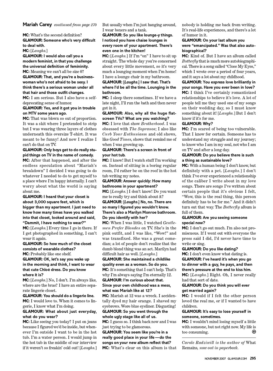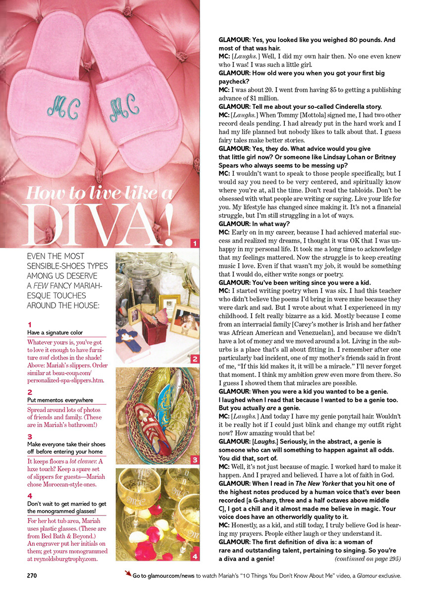 I have to confess: I had never met a diva before Mariah Carey. I wasn't even sure what one was, so I looked it up. First definition: a woman of outstanding and rare singing talent. Second definition: someone who is difficult to deal with. I'd met plenty of second-definition divas but never an actual one, so, naturally, I had outfit angst. What do you wear to meet a woman who sings in octaves most of us barely know exist? A ball gown? No, too dressy, plus mine has a burn on the sleeve. Jeans? No, too disrespectful. Red lipstick? No, too much. I settled on white pants, an AC/DC concert T-shirt and Chanel lip gloss. Meanwhile, Mariah answered the door herself, low-key, in a ponytail and pink hoodie. So this, I thought, is a diva?
