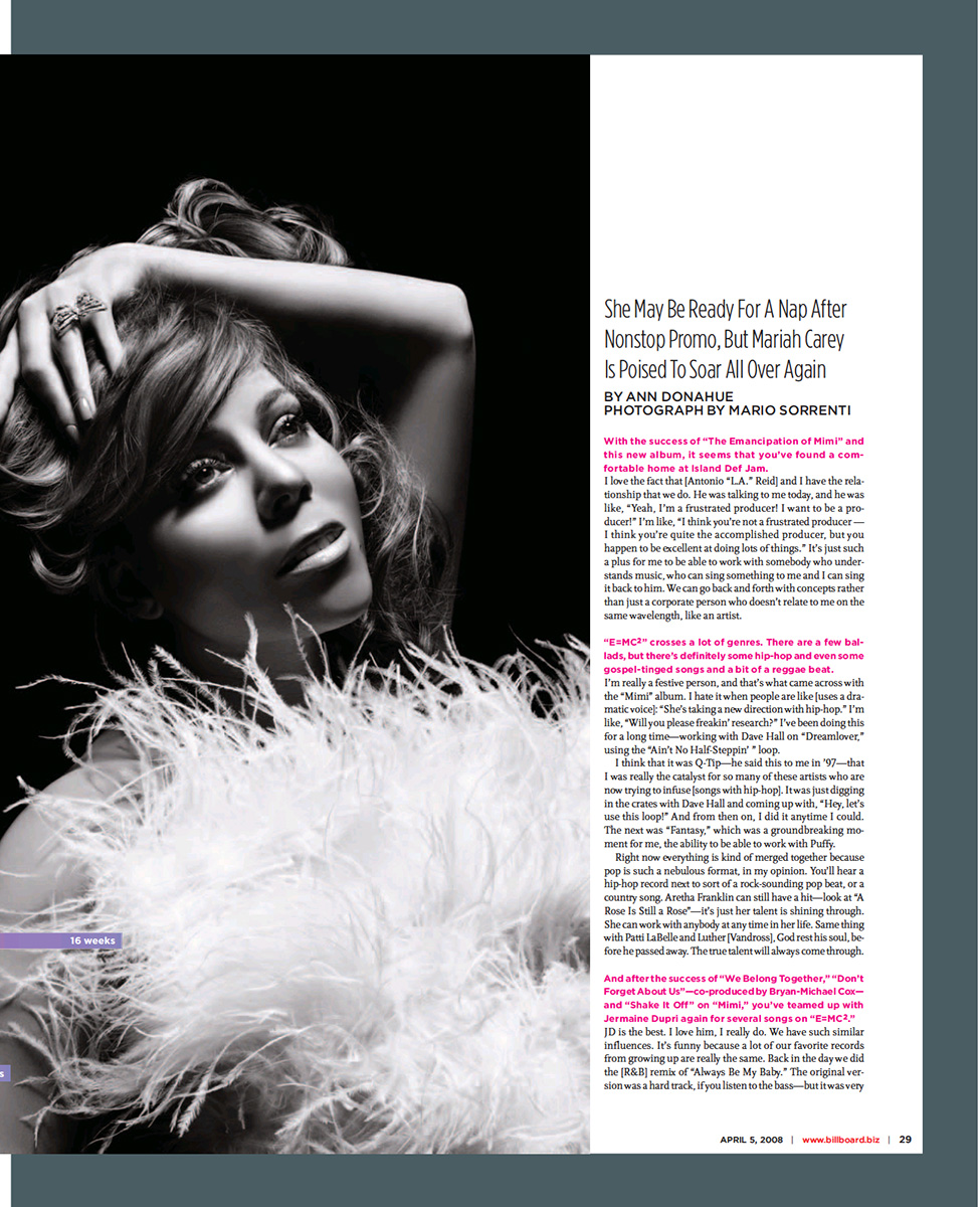 “Mariah loves to collaborate with writers and producers, and we had success with Tricky [Stewart] and The-Dream,” Island Def Jam Music Group chairman Antonio “L.A.” Reid says. “She went into the studio with them, we closed the door, and when we opened it up they had several ideas, one of which became ‘Touch My Body.’ ”