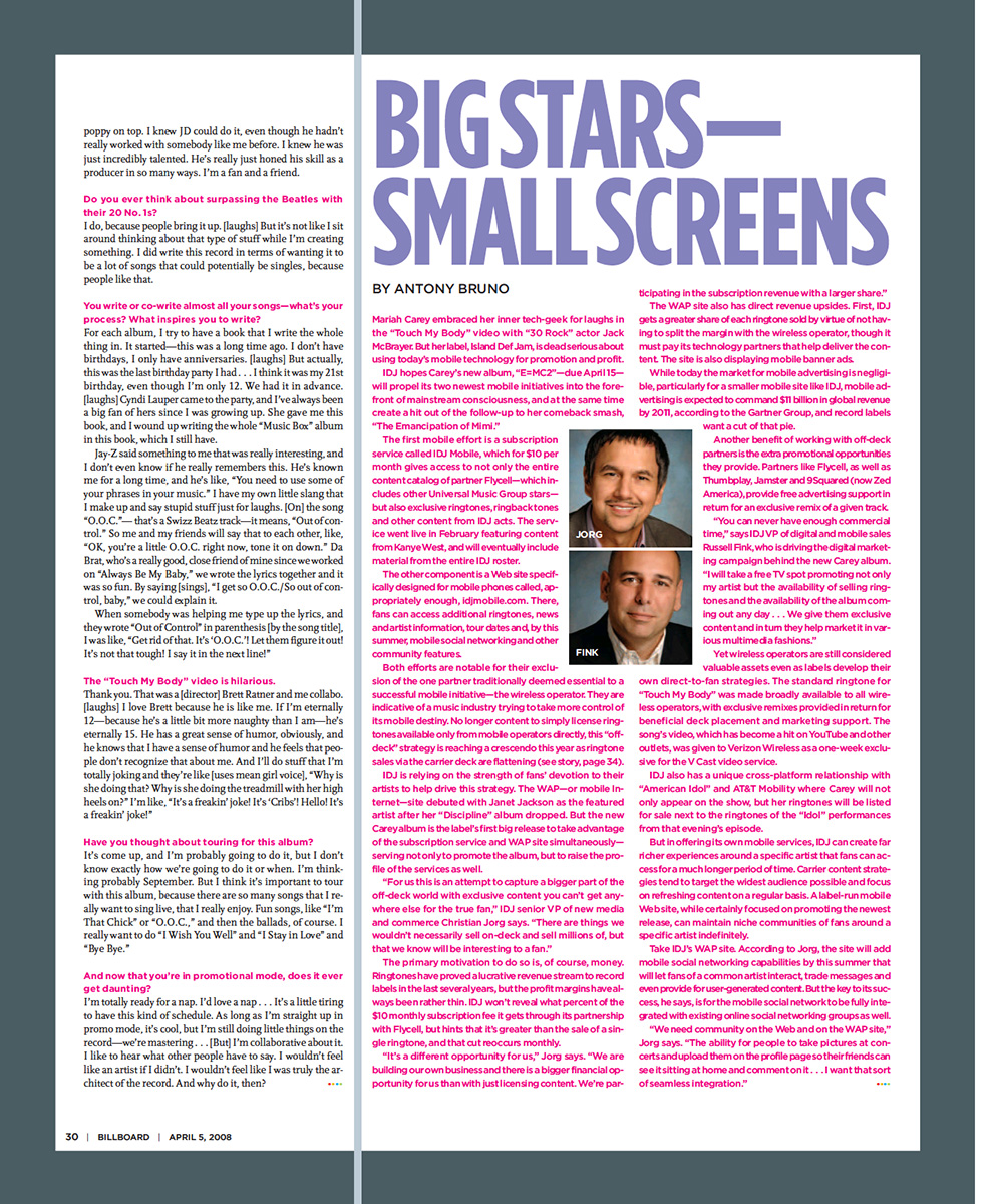 For E=MC², Carey's strategy is to lure new fans with several big-ticket promotional appearances. She will be heavily involved with Fox's American Idol this year, appearing on the show's charity effort, Idol Gives Back and acting as a mentor/guest judge the week E=MC² comes out. “She loves working with developing artists, and she has such a body of work to pull from,” Veazey says. “It was a perfect fit.”