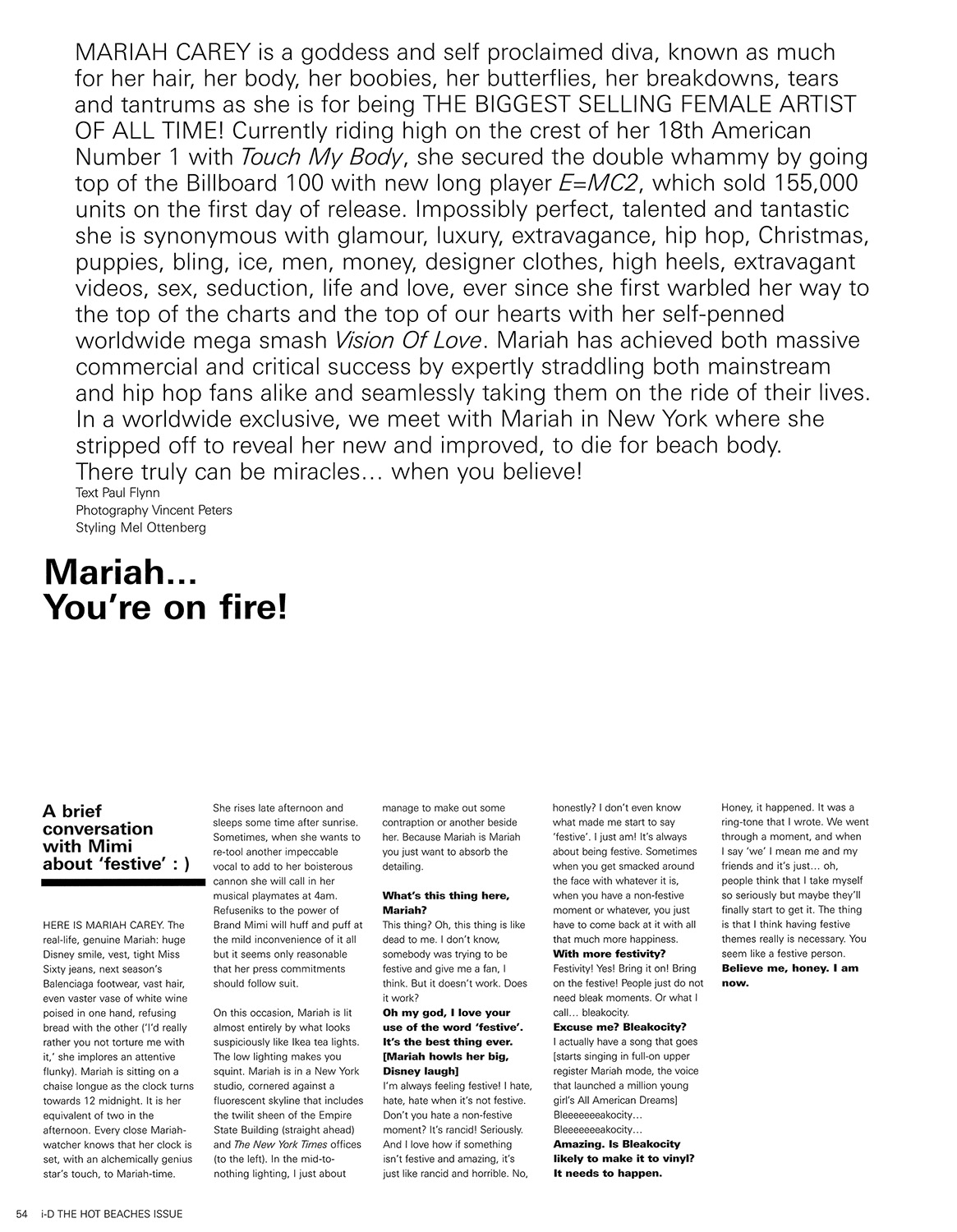 Operating in a space outside of irony and reliant only on her immediately identifiable and mostly magnificent gift for singing and telling simple, literal truths through song, Mariah is the modern music industry's own watermark for international success. With a breezy defiance, two weeks after our meet in NYC, she deftly hangs up the phone live on air during a Radio One chart show interview as the DJ attempts to wow at her 80 million plus recorded sales.