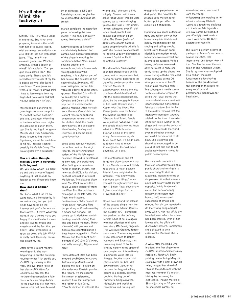 Three different titles had been mooted by Billboard magazine before camp Mariah — and believe me, it is — settled on the audacious Einstein pun for the record. It's the second installment of glistening, modern funk that comprises the rebirth of Ms Carey. “People decided to roll with the wrong title,” she says, a little snippily. “I never said it was called ‘That Chick.’ People were coming up to me and saying ‘Please don't call it That Chick.’ I mean, whatever, even if I did, when I told people I was coming out with an album called The Emancipation of Mimi some people hated it, some people loved it. All this is just” She pauses, to accentuate her feeling vaguely disgusted at the word. “opinion. Until something is proven.”