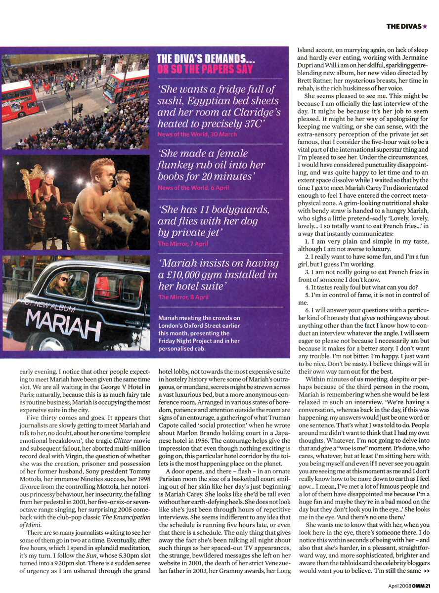 “Here's the thing,” confides Mariah, softly, extremely skilled at talking about herself to a total stranger and pretending it's a very natural thing to do.