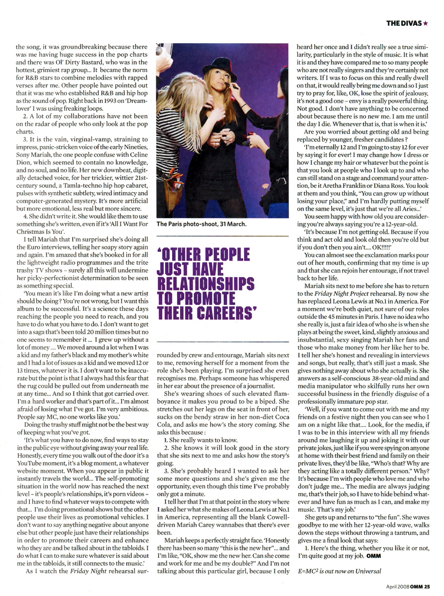 Mariah sits next to me before she has to return to the Friday Night Project rehearsal. By now she has replaced Leona Lewis at No.1 in America. For a moment we're both quiet, not sure of our roles outside the 45 minutes in Paris. I have no idea who she really is, just a fair idea of who she is when she plays at being the sweet, kind, slightly anxious and insubstantial, sexy singing Mariah her fans and those who make money from her like her to be. I tell her she's honest and revealing in interviews and songs, but really, that's still just a mask. She gives nothing away about who she actually is. She answers as a self-conscious 38-year-old mind and media manipulator who skillfully runs her own successful business in the friendly disguise of a professionally immature pop star.