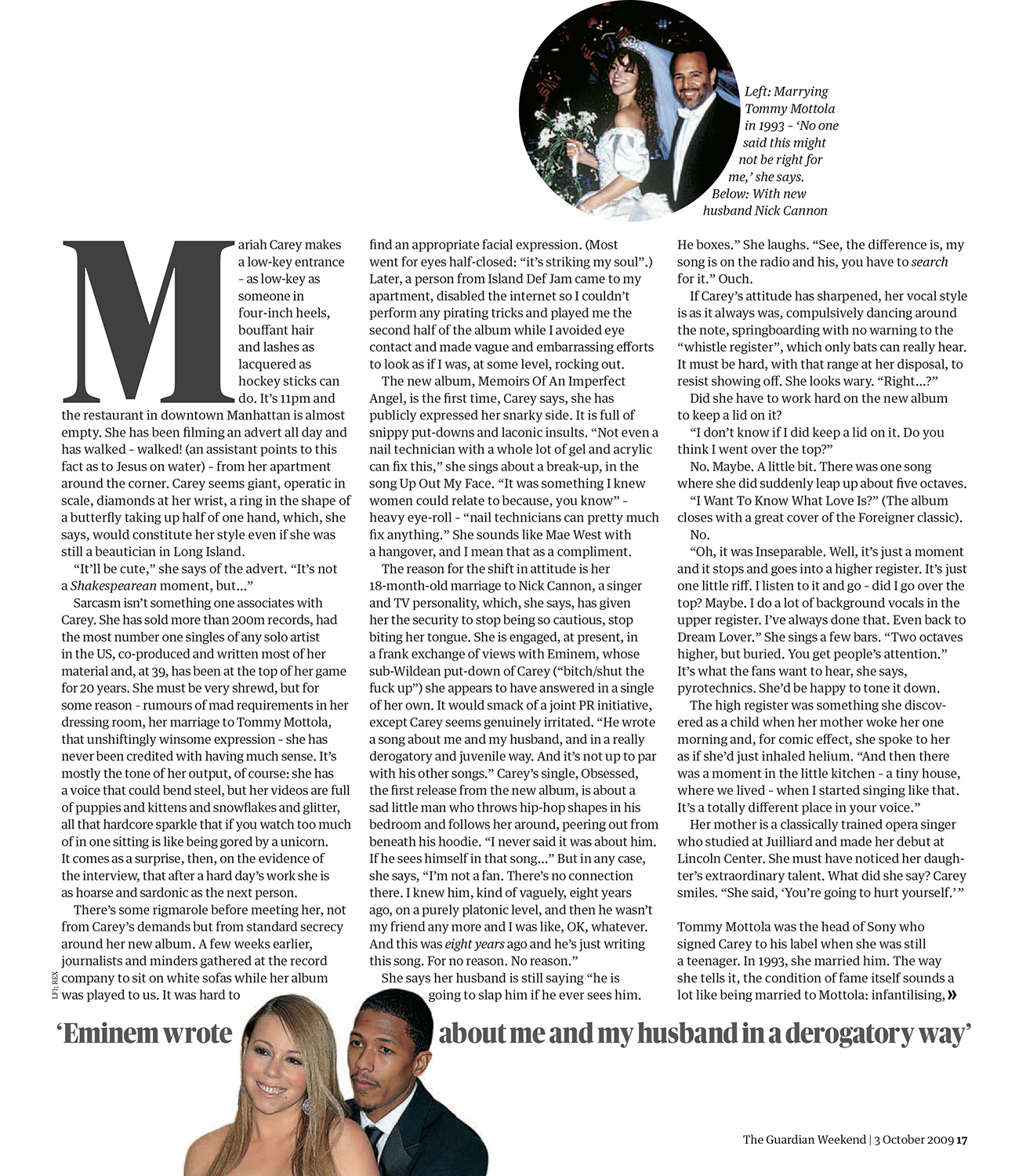 The reason for the shift in attitude is her 18-month-old marriage to Nick Cannon, a singer and TV personality, which, she says, has given her the security to stop being so cautious, stop biting her tongue. She is engaged, at present, in a frank exchange of views with Eminem, whose sub-Wildean put-down of Carey (“bitch/shut the fuck up”) she appears to have answered in a single of her own. It would smack of a joint PR initiative, except Carey seems genuinely irritated. “He wrote a song about me and my husband, and in a really derogatory and juvenile way. And it's not up to par with his other songs.” Carey's single, “Obsessed,” the first release from the new album, is about a sad little man who throws hip-hop shapes in his bedroom and follows her around, peering out from beneath his hoodie. “I never said it was about him. If he sees himself in that song…” But in any case, she says, “I'm not a fan. There's no connection there. I knew him, kind of vaguely, eight years ago, on a purely platonic level, and then he wasn't my friend any more and I was like, OK, whatever. And this was eight years ago and he's just writing this song. For no reason. No reason.”