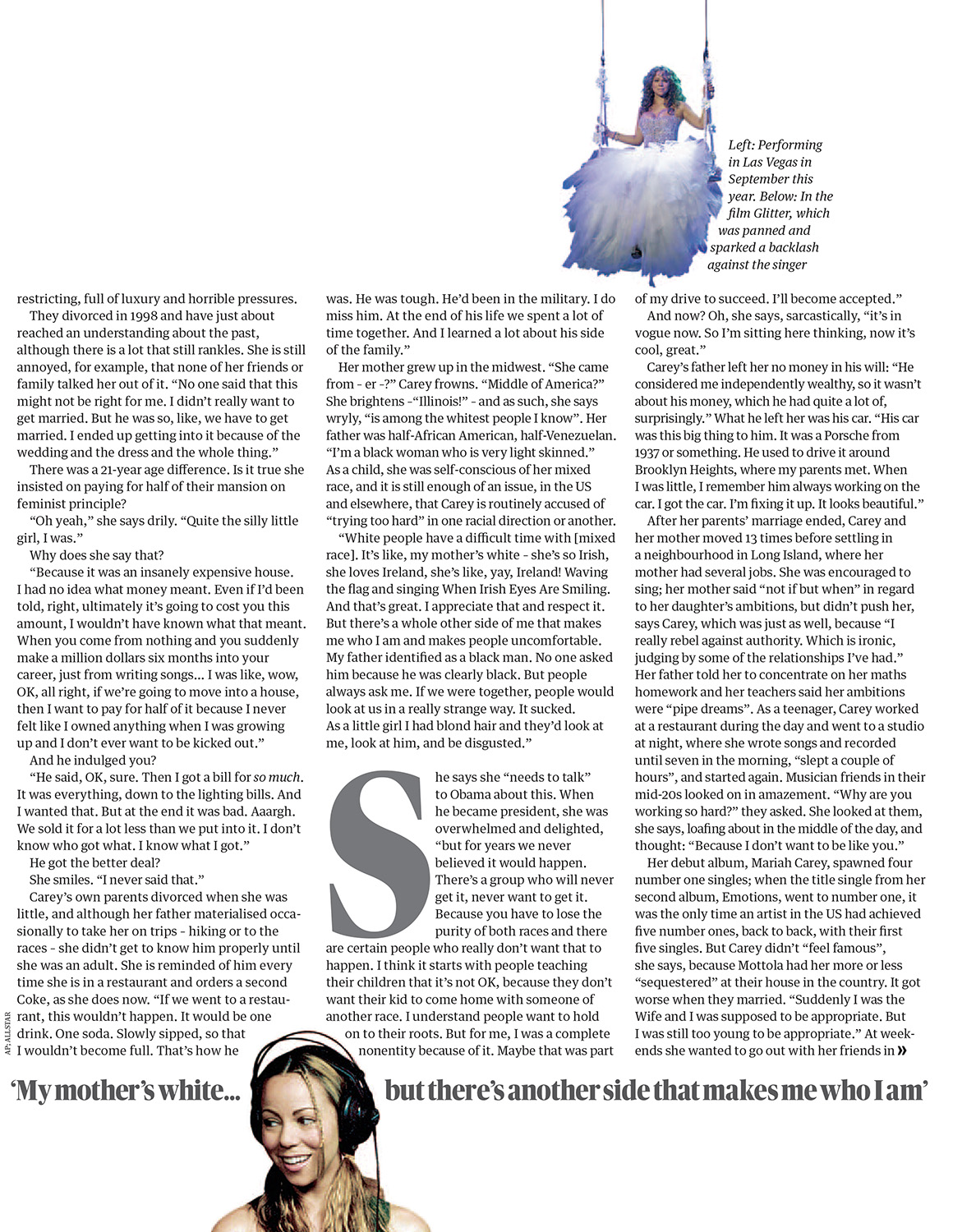 Her mother grew up in the midwest. “She came from — er — ?” Carey frowns. “Middle of America?” She brightens — “Illinois!” — and as such, she says wryly, “is among the whitest people I know”. Her father was half-African American, half-Venezuelan. “I'm a black woman who is very light skinned.” As a child, she was self-conscious of her mixed race, and it is still enough of an issue, in the US and elsewhere, that Carey is routinely accused of “trying too hard” in one racial direction or another.