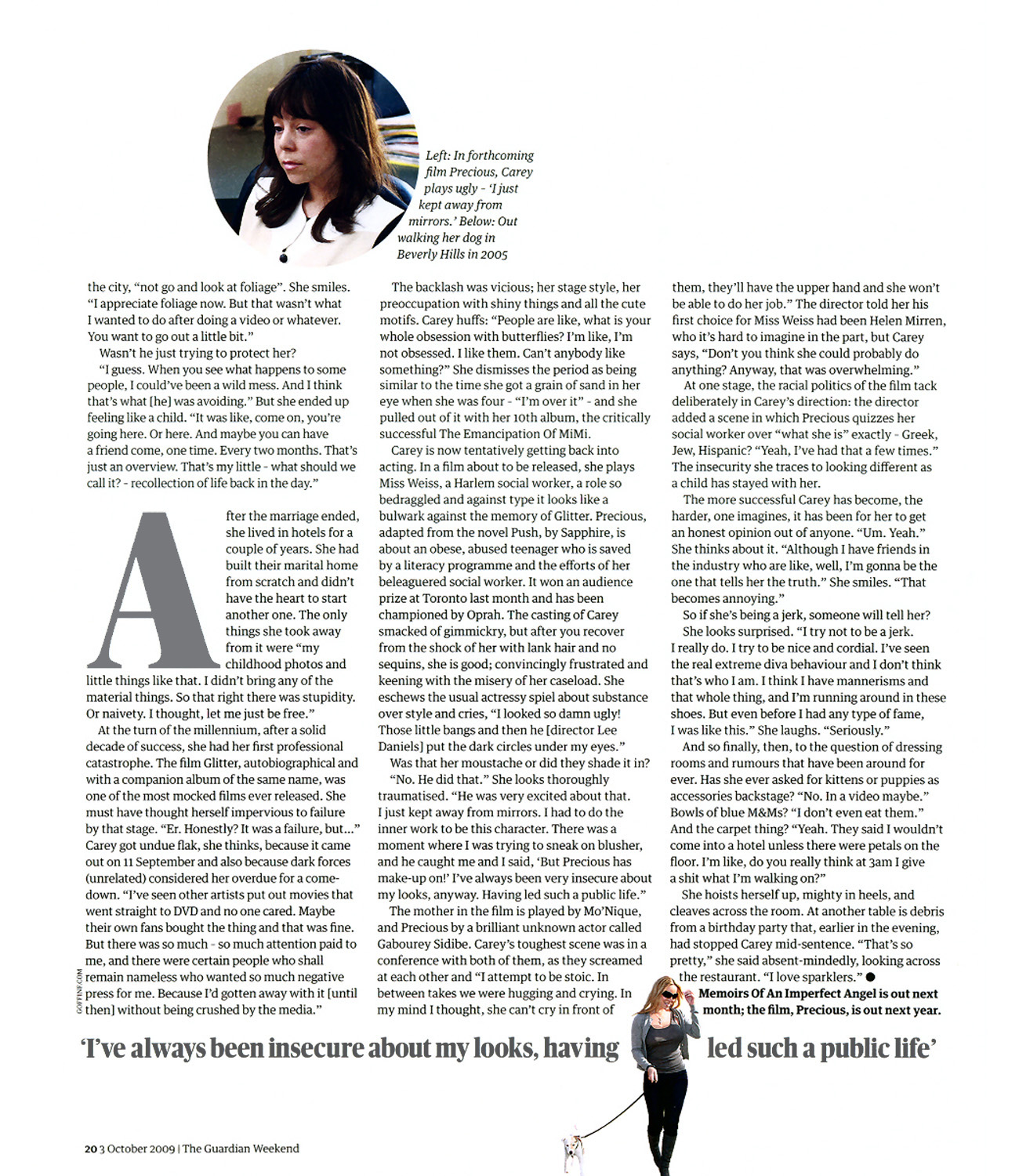 Carey is now tentatively getting back into acting. In a film about to be released, she plays Miss Weiss, a Harlem social worker, a role so bedraggled and against type it looks like a bulwark against the memory of Glitter. Precious, adapted from the novel Push, by Sapphire, is about an obese, abused teenager who is saved by a literacy programme and the efforts of her beleaguered social worker. It won an audience prize at Toronto last month and has been championed by Oprah. The casting of Carey smacked of gimmickry, but after you recover from the shock of her with lank hair and no sequins, she is good; convincingly frustrated and keening with the misery of her caseload. She eschews the usual actressy spiel about substance over style and cries, “I looked so damn ugly! Those little bangs and then he [director Lee Daniels] put the dark circles under my eyes.”