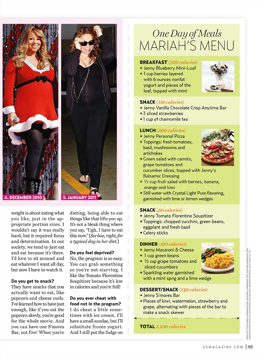 And did she ever. Not only was the hitmaker able to strut to her songs “Shake It Off” and “Fly Like a Bird” at the Us shoot, she also slid into size-6 shorts. Her secret? A nutrition and workout plan from Jenny (formerly Jenny Craig). Starting with a 1,500-calorie-a-day menu and thrice-weekly workouts in July, Carey began losing one to two pounds a week. As her advisers monitored her progress on the plan's at-home delivery service with weekly consultations and weigh-ins, she decreased to 1,200 calories a day a month later. Now the brand's ambassador, Carey opens up to Us about reclaiming her svelte figure.