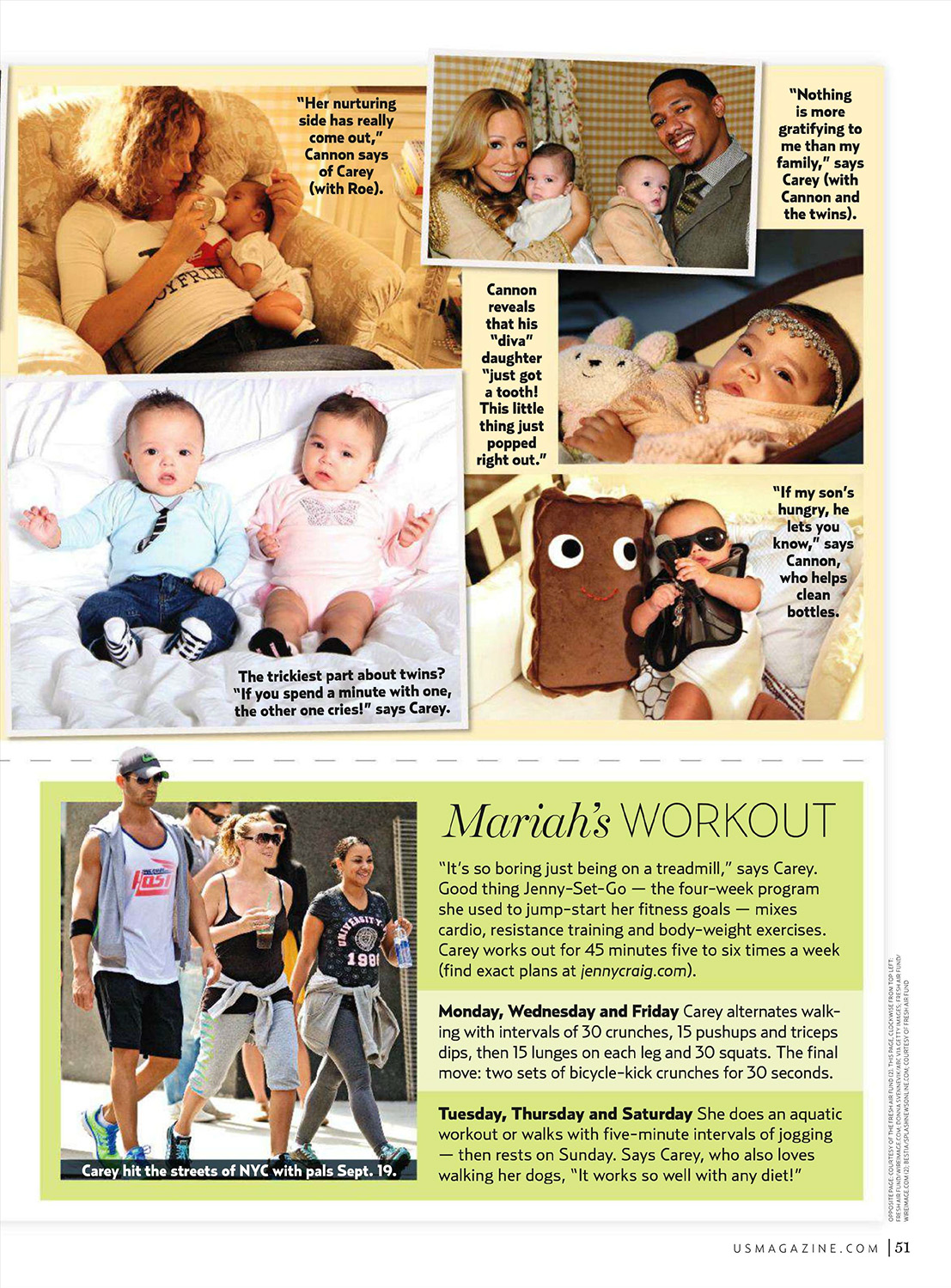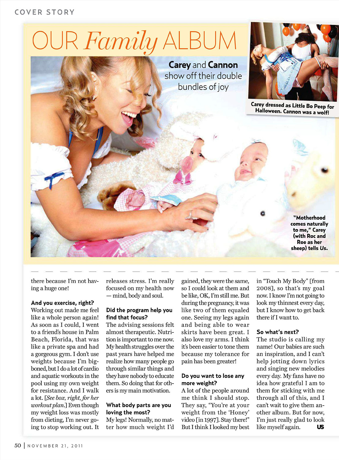 “Do my legs look good?” a beaming Mariah Carey asked as she posed for Us at NYC's Industria studios on November 4. Not that she needed reassurance. The first-time mom proudly showed off her toned gams and flat stomach — the hard-earned results of losing 30 pounds after giving birth on April 30 to twins Moroccan and Monroe (with husband Nick Cannon). Getting her body back once seemed to be a, well, sweet fantasy for the star. After finally conceiving (Carey took what she called “excruciatingly painful” regular progesterone shots, a hormone often prescribed to boost fertility, then continued the shots for 10 weeks afterward to reduce the risk of miscarriage), the singer developed gestational diabetes, suffered a double hernia and was eventually put on extended bed rest before delivering “Roc” and “Roe” via C-section at 35 weeks. “I gained an enormous amount of weight. I was scared I was never going to walk again!” the Grammy winner confesses. “After carrying two 6-pound babies around, I had to relearn how to do it.”