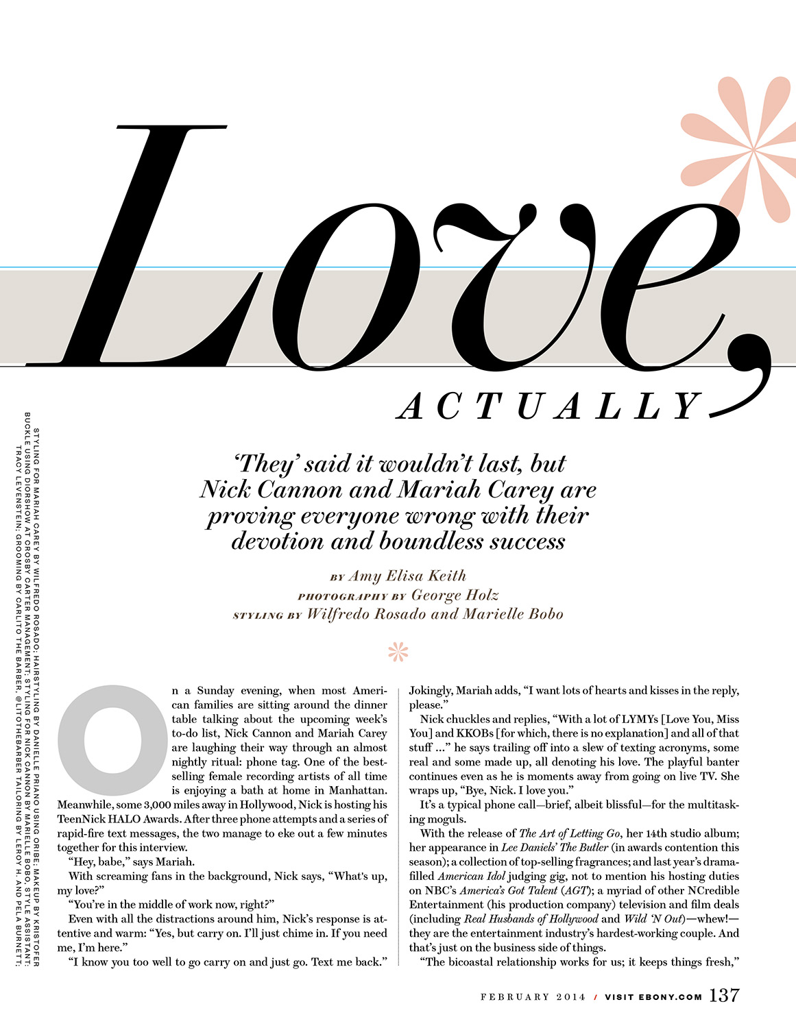 On a Sunday evening, when most American families are sitting around the dinner table talking about the upcoming week's to-do list, Nick Cannon and Mariah Carey are laughing their way through an almost nightly ritual: phone tag. One of the best- selling female recording artists of all time is enjoying a bath at home in Manhattan. Meanwhile, some 3,000 miles away in Hollywood, Nick is hosting his TeenNick HALO Awards. After three phone attempts and a series of rapid-fire text messages, the two manage to eke out a few minutes together for this interview.