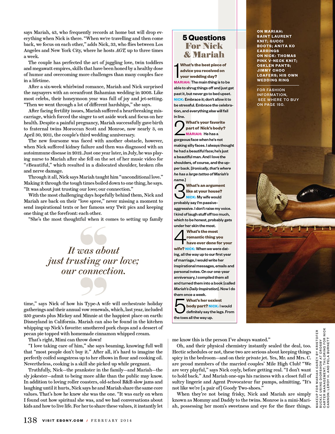 Oh, and their physical chemistry instantly sealed the deal, too. Hectic schedules or not, these two are serious about keeping things spicy in the bedroom — and on their private jet. Yes, Mr. and Mrs. C. are proud members of the married couples' Mile High Club! “We are very playful,” says Nick coyly, before getting real. “I don't want to hold back.” And Mariah one-ups his raciness with a closet full of sultry lingerie and Agent Provocateur fur pumps, admitting, “It's not like we're [a pair of] Goody Two-shoes.”