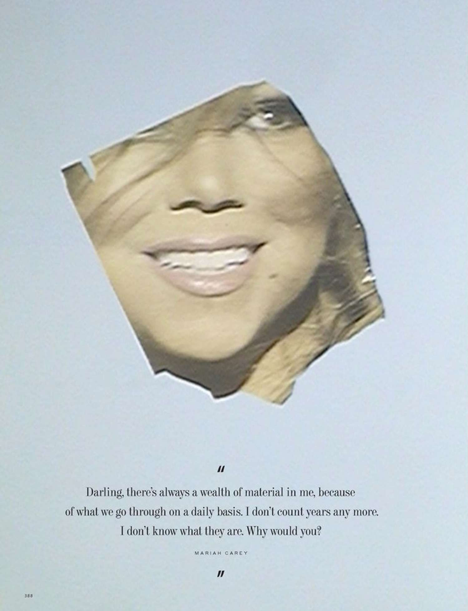 Next year, little Mariah Carey, the baby introduced to Carey at her first record store signings, will turn 30. The book has a lot of ground to cover. “Darling, there's always a wealth of material in me, because of what we go trough on a daily basis. I don't count years any more. I don't know what they are. Why would you?”