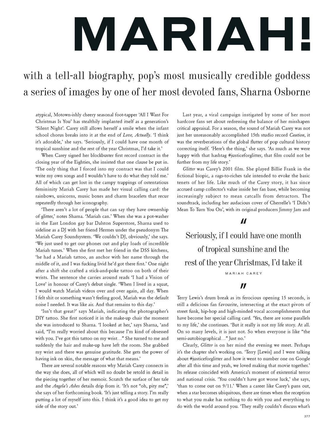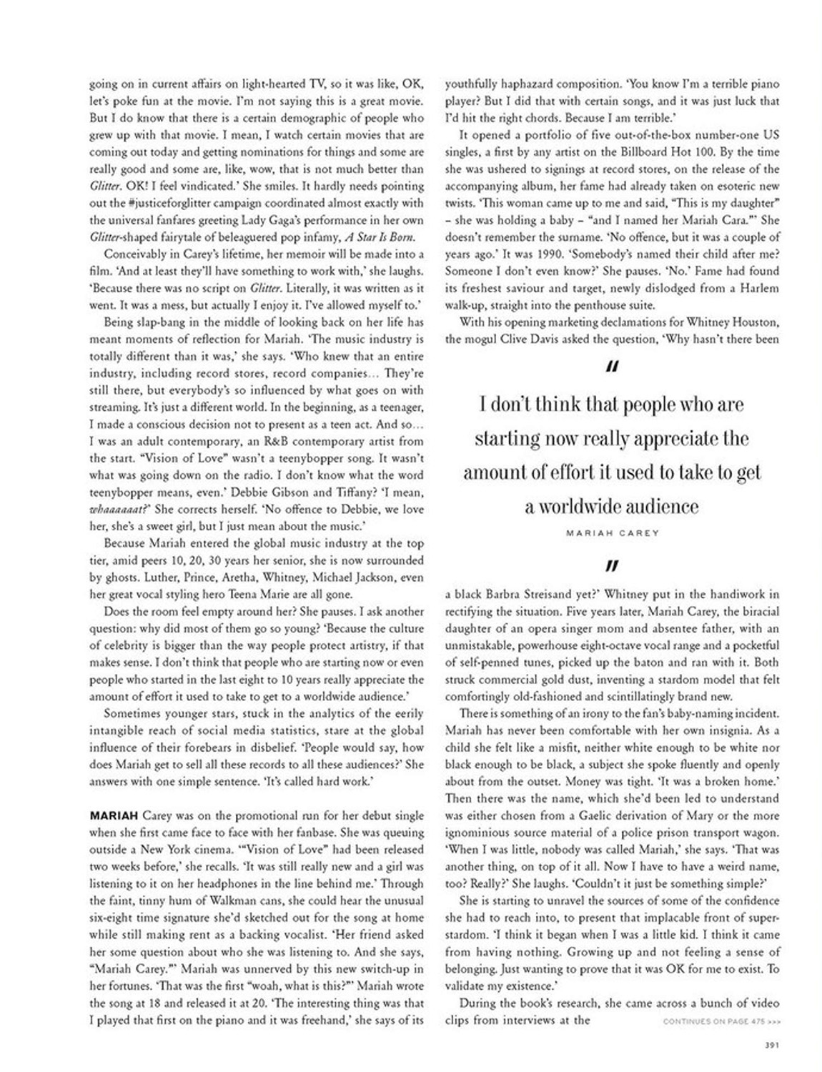 Conceivably in Carey, lifetime, her memoir will be made into a film. “And at least they'll have something to work with,” she laughs. “Because there was no script on Glitter. Literally, it was written as it went. It was a mess, but actually I enjoy it. I've allowed myself to.”