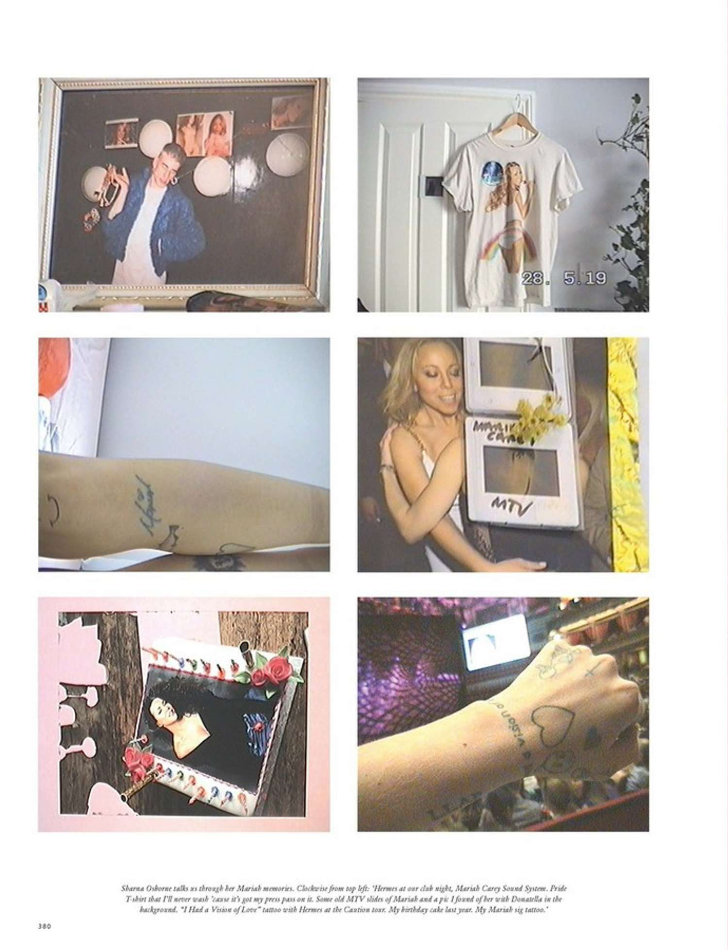 “There aren't a lot of people that can say they have ownership of glitter,” notes Sharna. “Mariah can.” When she was a pot-washer in the East London gay bar Dalston Superstore, Sharna used to sideline as a DJ with her friend Hermes under the pseudonym The Mariah Carey Soundsystem. “We couldn't DJ, obviously,” she says. “We just used to get our phones out and play loads of incredible Mariah tunes.” When she first met her friend in the DSS kitchens, “he had a Mariah tattoo, an anchor with her name through the middle of it, and I was fucking livid he'd got there first.” One night after a shift she crafted a stick-and-poke tattoo on both of their wrists. The sentence she carries around reads “I had a Vision of Love” in honour of Carey's debut single. “When I lived in a squat, I would watch Mariah videos over and over again, all day. When I felt shit or something wasn't feeling good, Mariah was the default noise I needed. It was like air. And that remains to this day.”