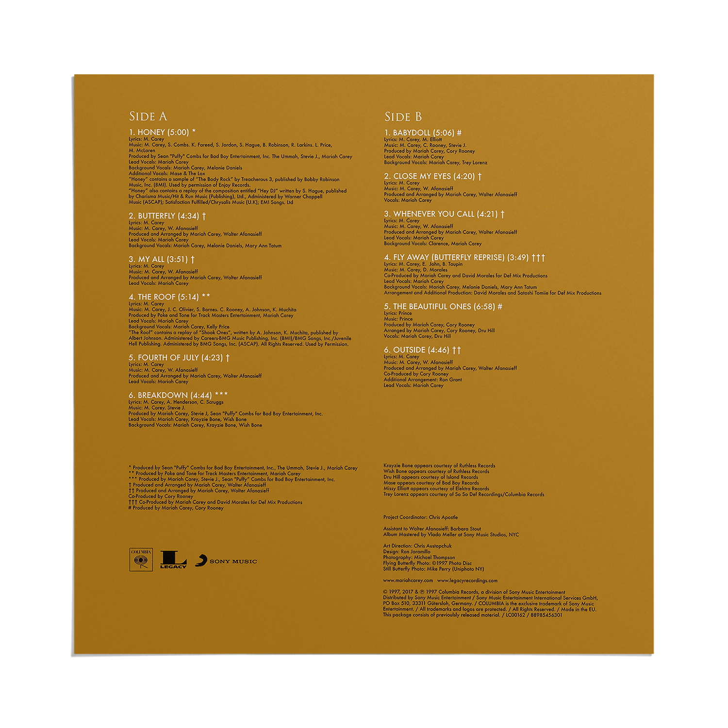 International editions of the Butterfly album include two remixes of “Honey” as bonus tracks. In 1998, the album was reissued in Latin America to include “Mi Todo,” the Spanish version of “My All.”
