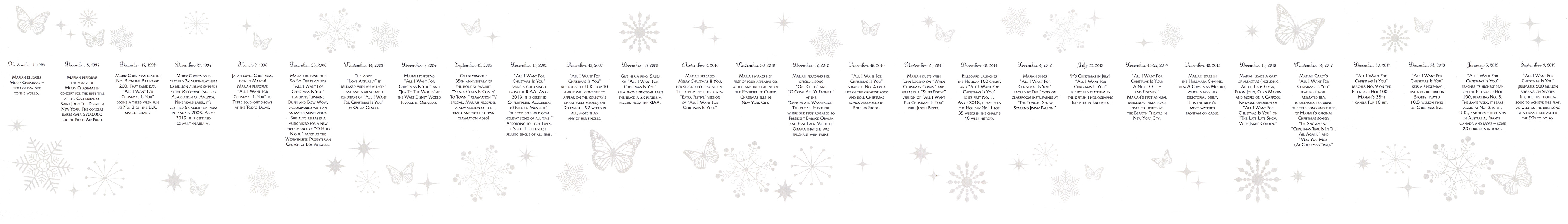 2019 saw the release of the Deluxe Anniversary Edition of Merry Christmas, which includes a bonus disc with a new “Sugar Plum Fairy” introlude, bonus tracks, and the previously-unavailable audio from Mariah's 1994 benefit concert at the Cathedral of St. John The Divine.